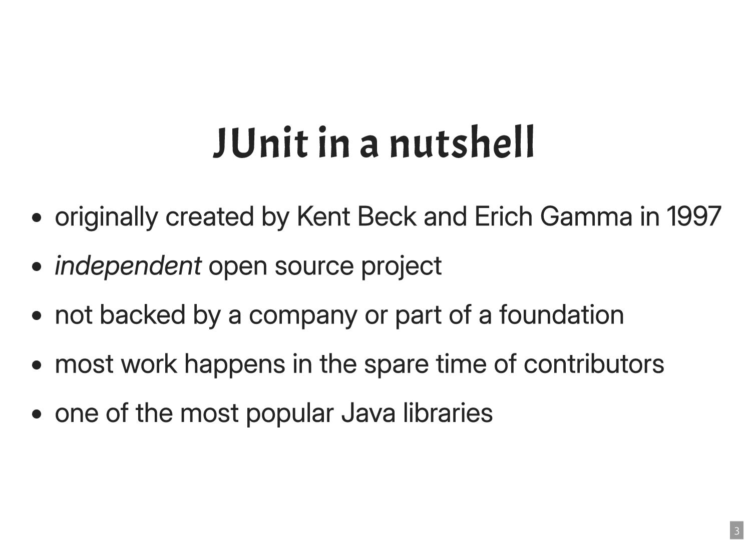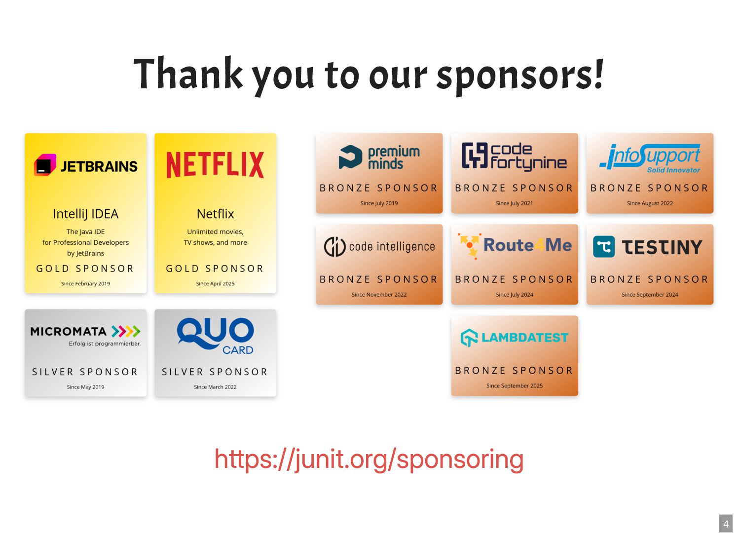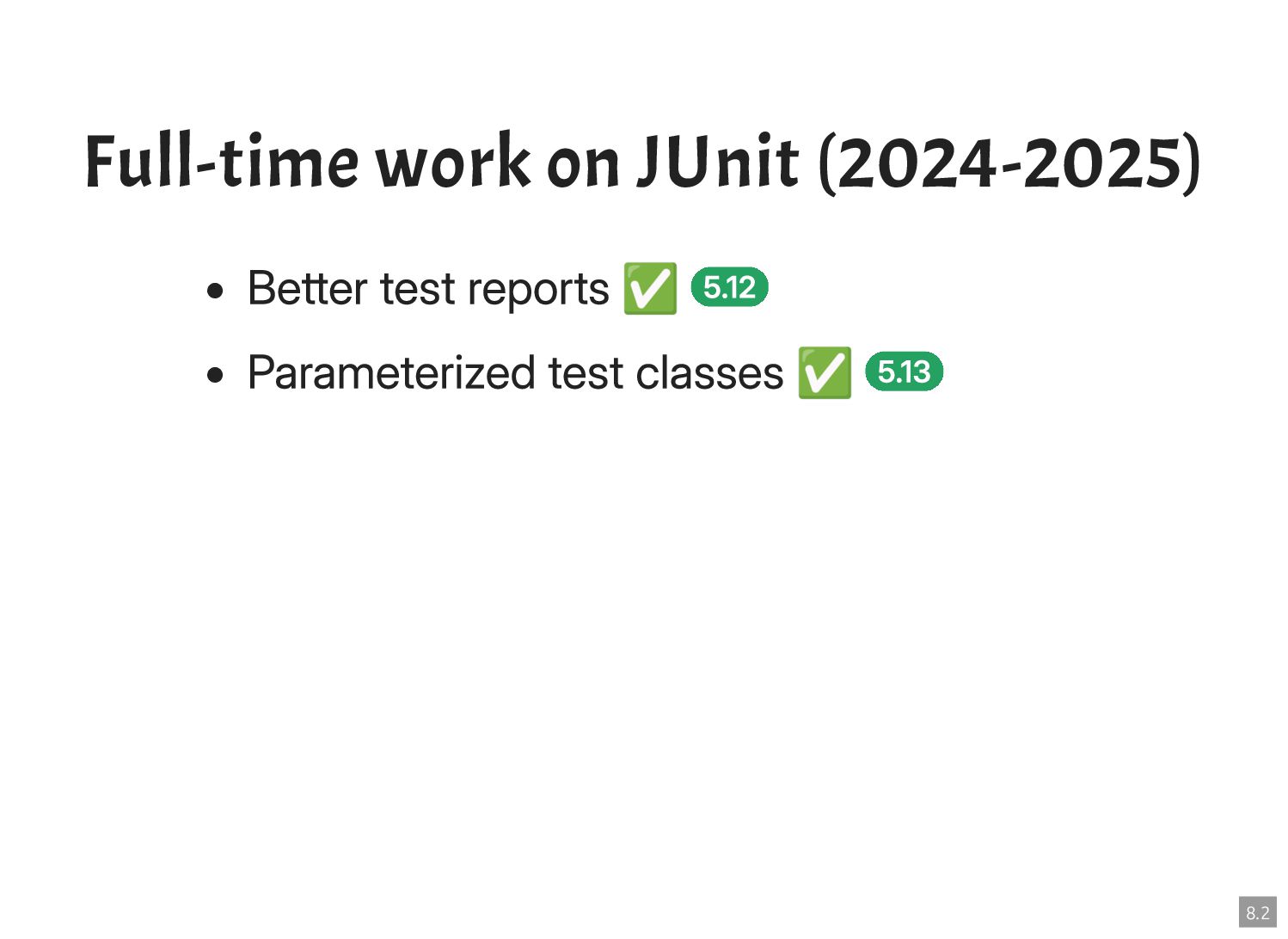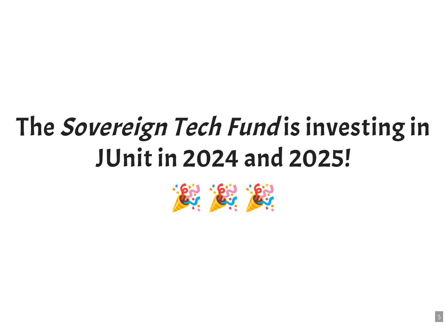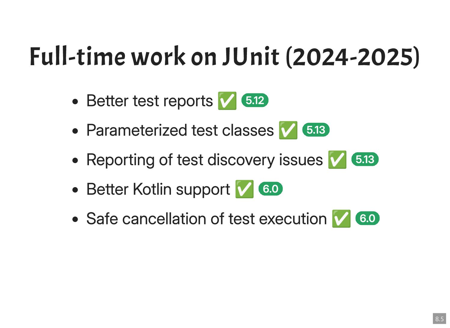 Thanks to the Sovereign Tech Fund I had the opportunity to work full-time on JUnit in 2025 and 2026. In this lightning talk, I will talk about my experience and will shortly introduce new features and improvements. Among them are Open Test Reporting, parameterized test classes, and discovery issues.