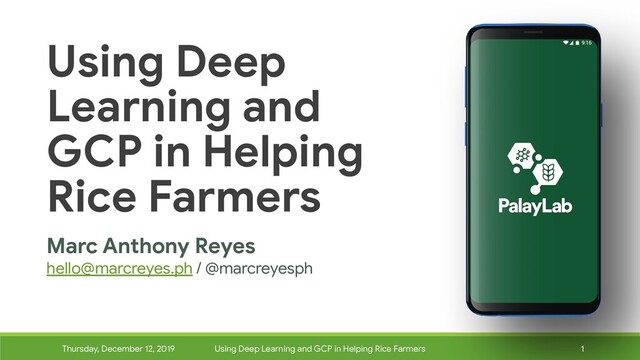 and weather condition as features for the model. Legacy support for phones that have deprecated API levels. Introduce mobile applications to government agencies for training of farmers Map severity of infestation/infection in a field Thursday, December 12, 2019 Using Deep Learning and GCP in Helping Rice Farmers 29