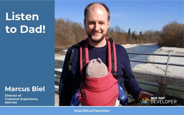In this talk, I want to share with you how I came to where I stand today. Husband and father of a 5 months old son, director of developer experience at Red Hat, traveling the world. I will share with you the good, the bad, the ugly. My failures and my learnings along the way. And, don't worry... some cloud related things too :)