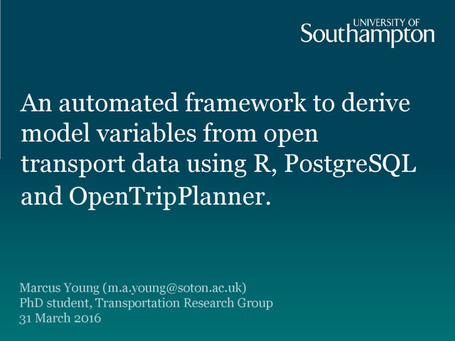 planner for GB and a framework to automate querying, processing and storage - using open source tools and open data • Main limitation: – Using TRACC to convert Traveline/TfL data to GTFS • Future plans: – Larger survey datasets – generating variables for up to 1M observations. – Contribute an OTP API wrapper R Package
