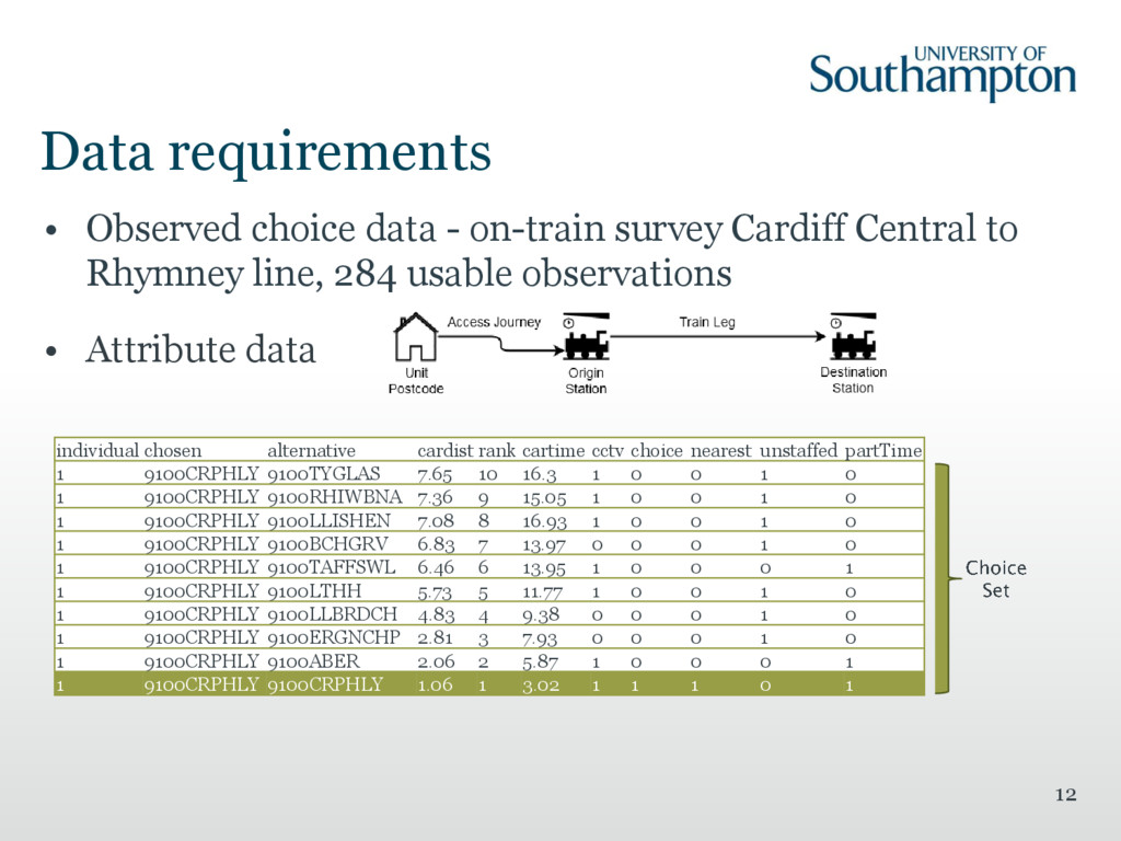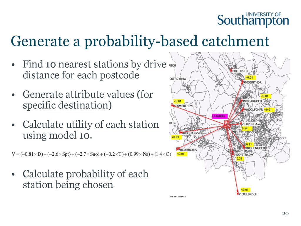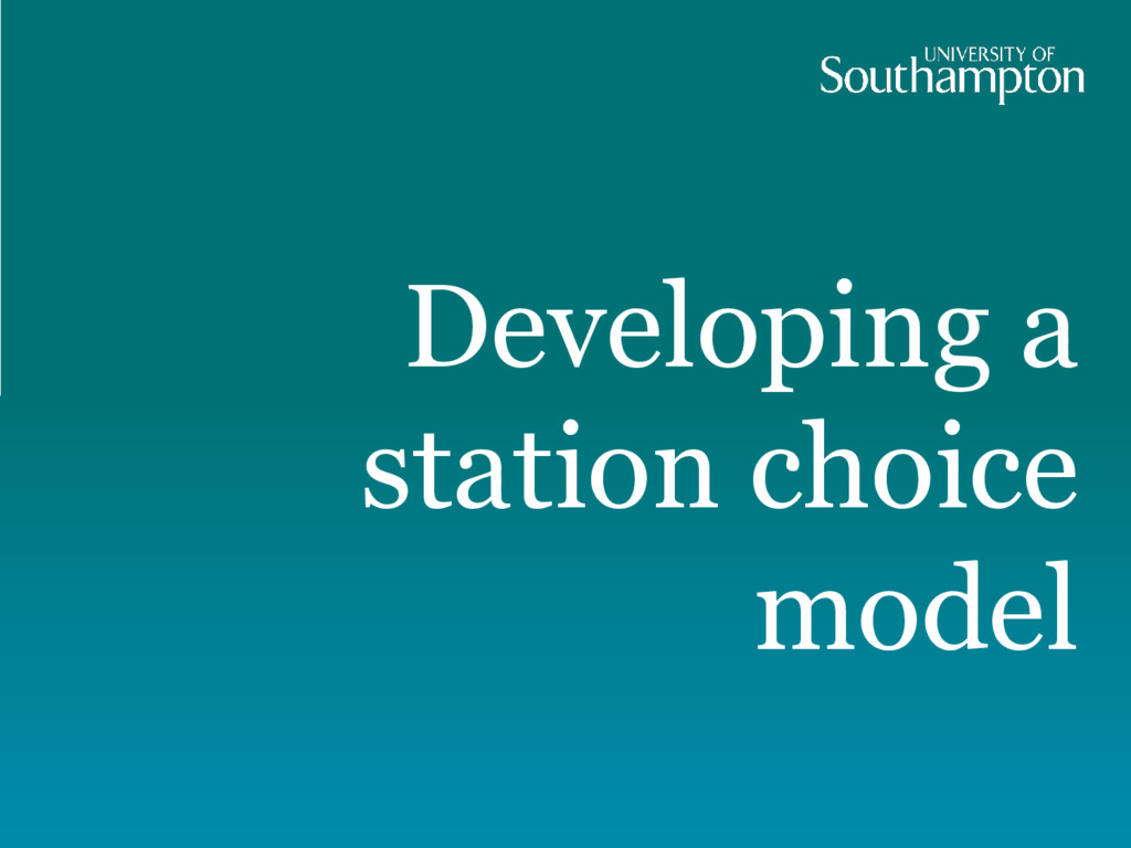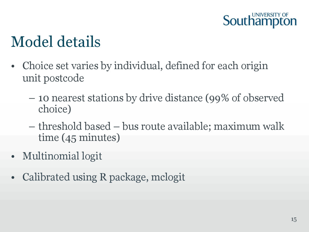 for each origin unit postcode – 10 nearest stations by drive distance (99% of observed choice) – threshold based – bus route available; maximum walk time (45 minutes) • Multinomial logit • Calibrated using R package, mclogit