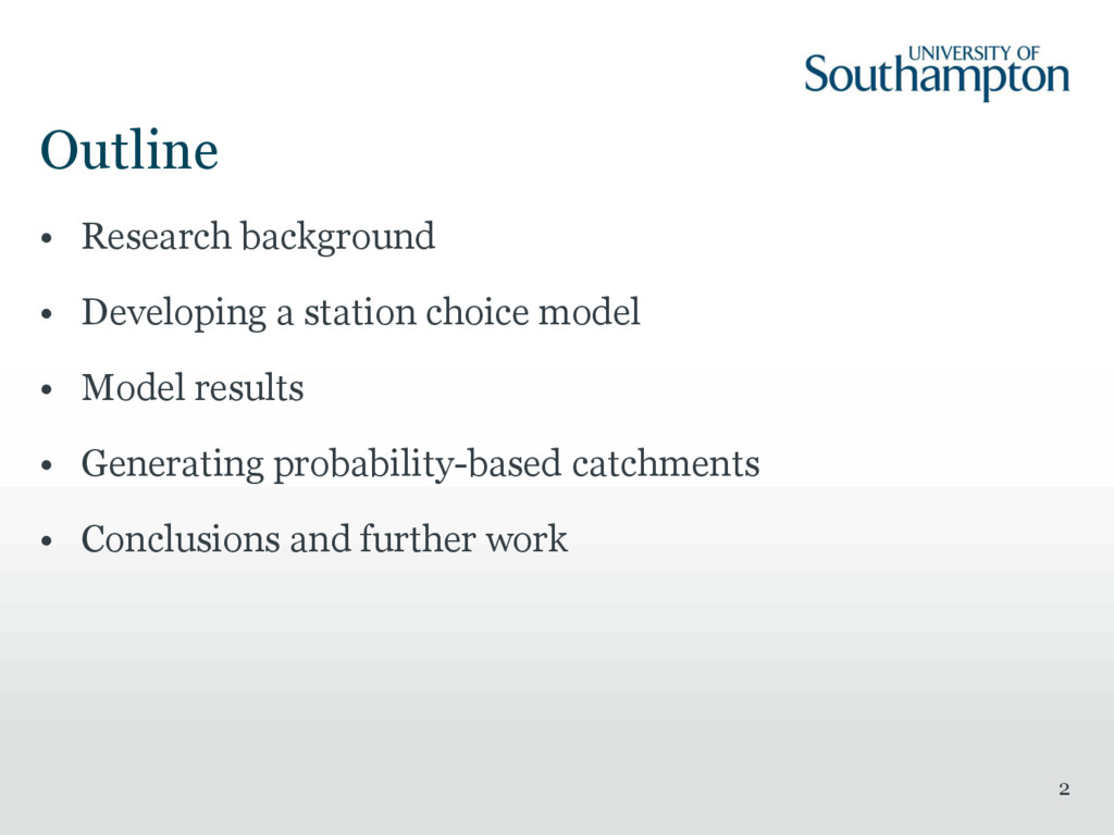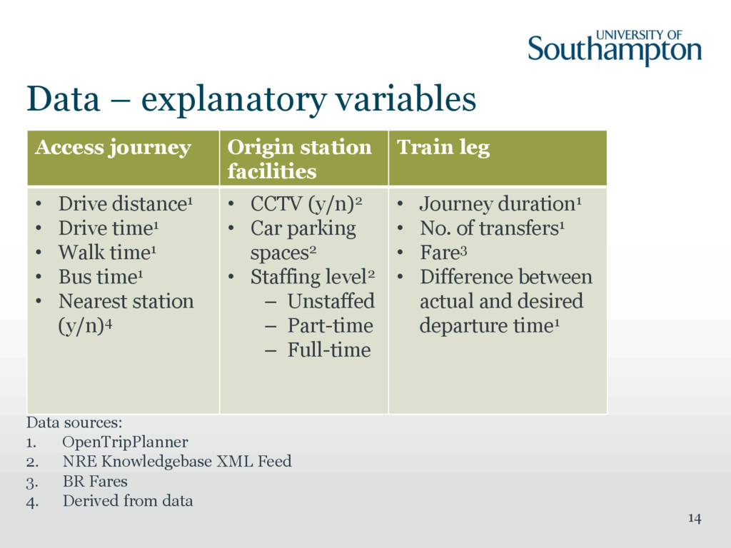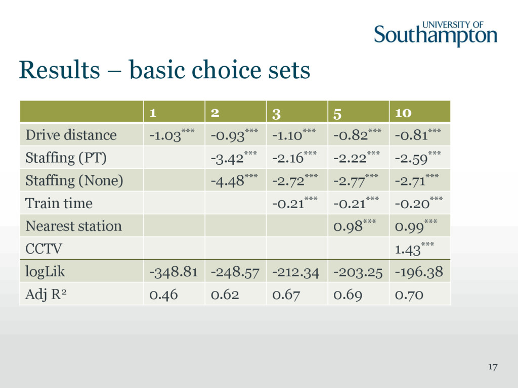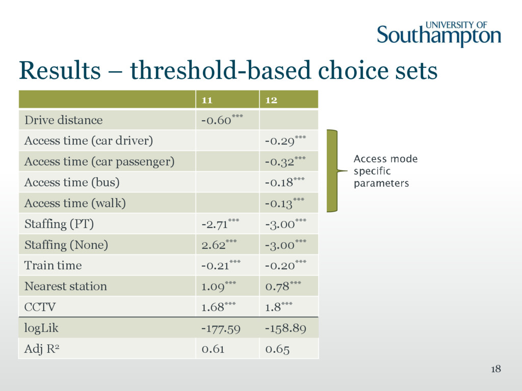 for each origin unit postcode – 10 nearest stations by drive distance (99% of observed choice) – threshold based – bus route available; maximum walk time (45 minutes) • Multinomial logit • Calibrated using R package, mclogit
