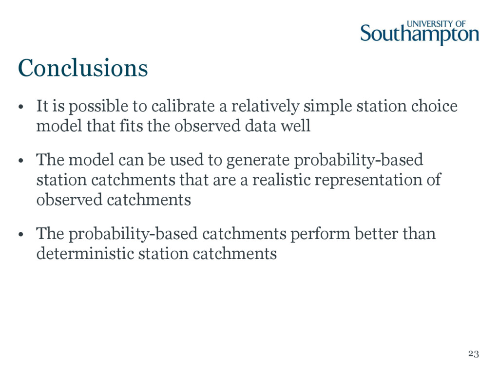station choice model that fits the observed data well • The model can be used to generate probability-based station catchments that are a realistic representation of observed catchments • The probability-based catchments perform better than deterministic station catchments 23