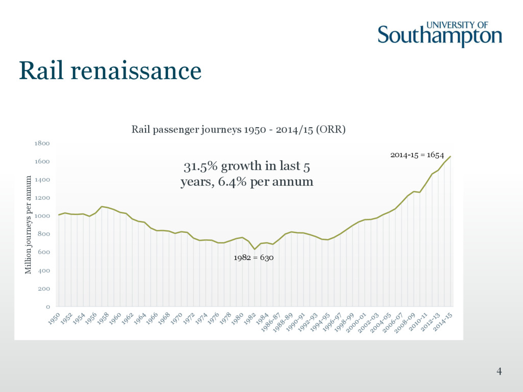 1400 1600 1800 Million journeys per annum Rail passenger journeys 1950 - 2014/15 (ORR) 1982 = 630 2014-15 = 1654 31.5% growth in last 5 years, 6.4% per annum
