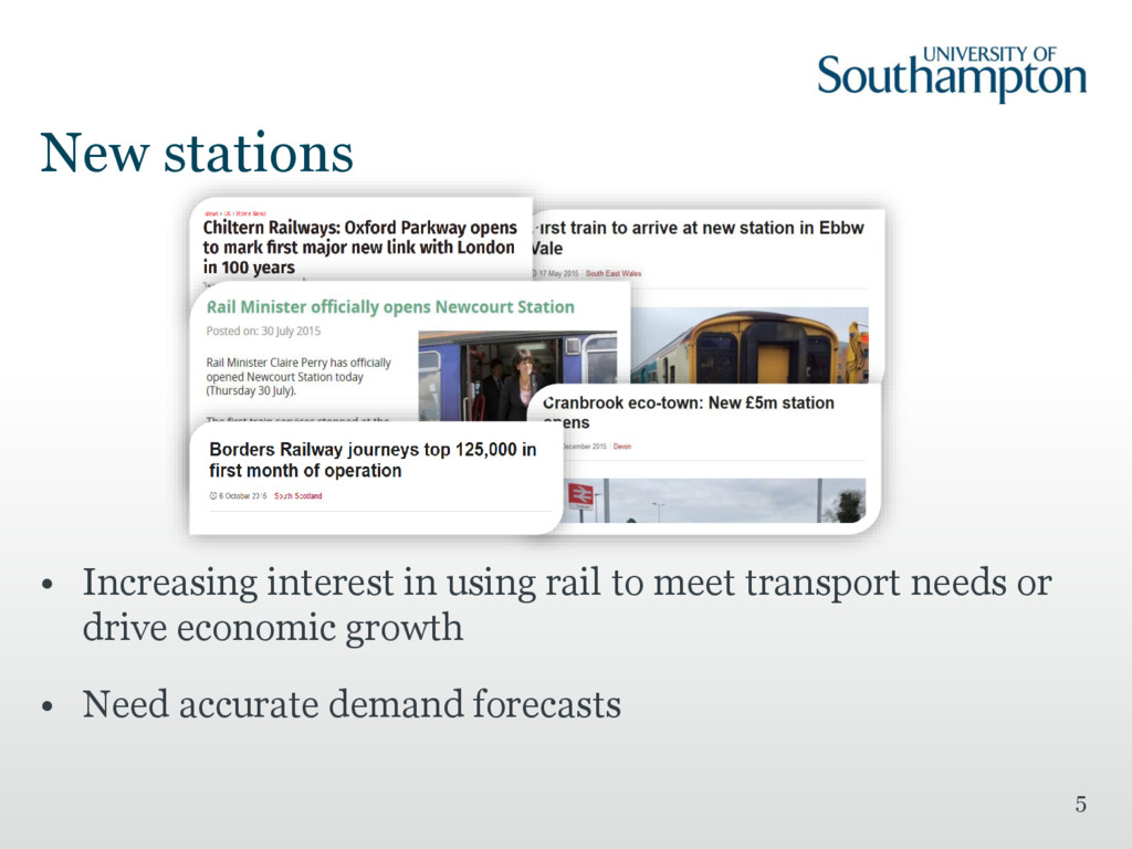 more sophisticated models - multinomial logit models suffer from proportional substitution behaviour • Need to ensure a realistic representation of abstraction from existing stations – this effect could undermine the business case for a new station • Incorporate probability-based catchments into the rail demand models 24