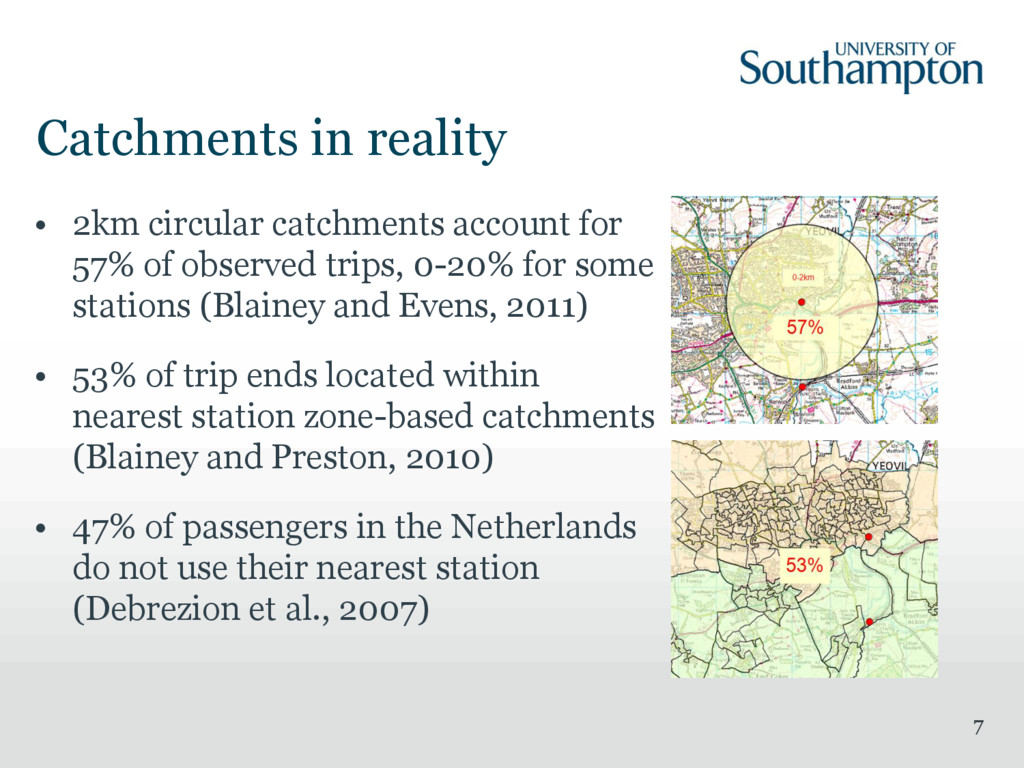 57% of observed trips, 0-20% for some stations (Blainey and Evens, 2011) • 53% of trip ends located within nearest station zone-based catchments (Blainey and Preston, 2010) • 47% of passengers in the Netherlands do not use their nearest station (Debrezion et al., 2007)