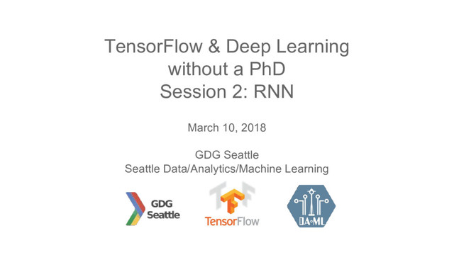 • 9:30 AM Check in & breakfast • 10:00 AM Tensorflow, deep learning and recurrent neural networks, without a PhD by Martin Gorner • 11:00 AM Tensorflow, deep learning and modern RNN architectures, without a PhD by Martin Gorner • 12:00 PM Lunch • 1:00 PM Codelab • 3:00 PM Wrap up @GDGSeattle #GDGSeattle #TensorFlow @SeaDAML