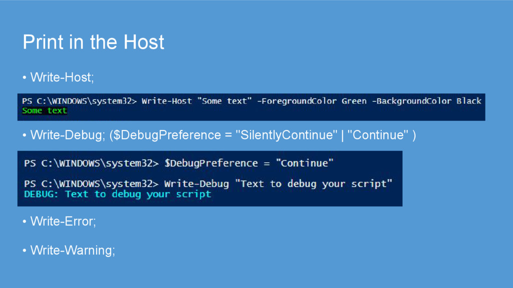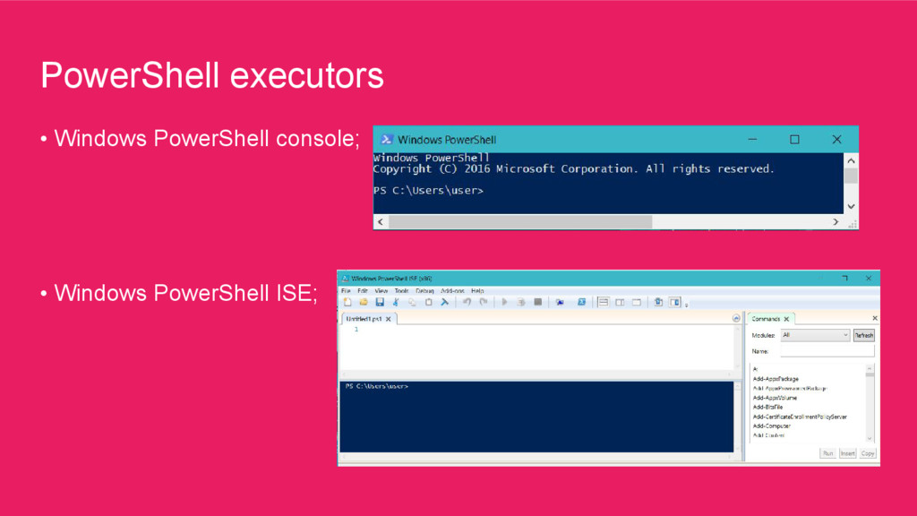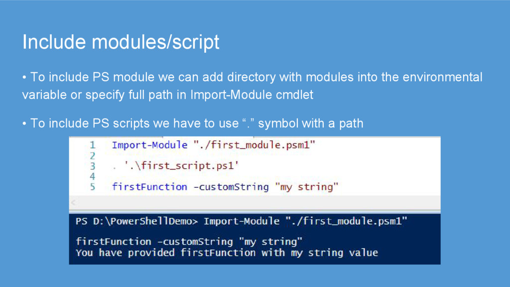 directory with modules into the environmental variable or specify full path in Import-Module cmdlet • To include PS scripts we have to use “.” symbol with a path