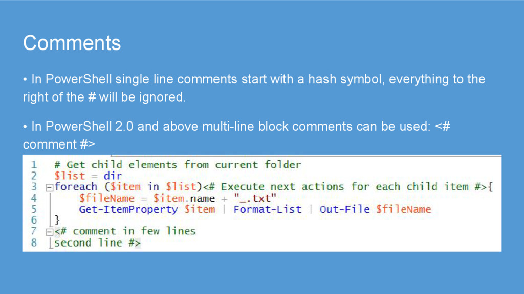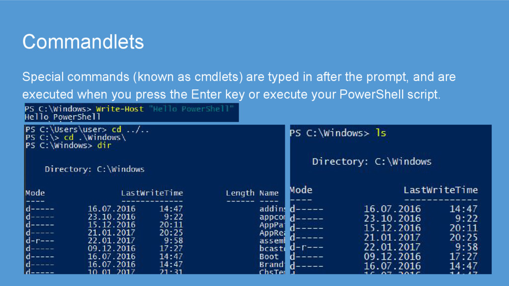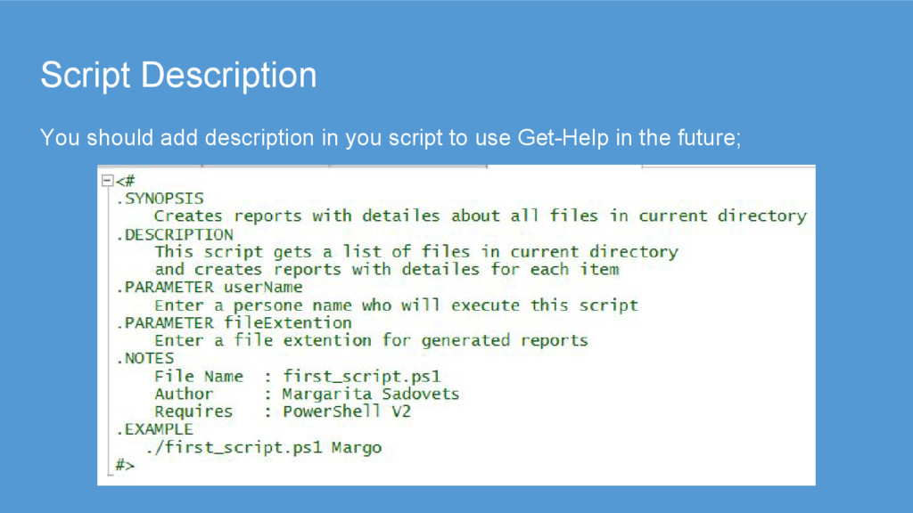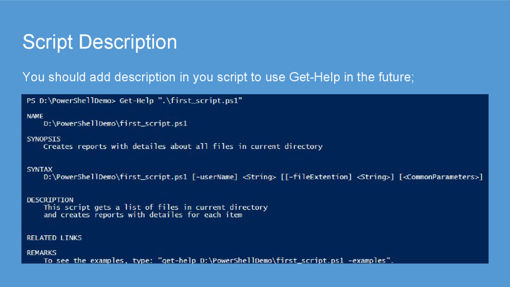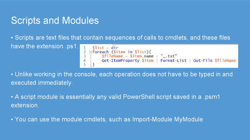 sequences of calls to cmdlets, and these files have the extension .ps1. • Unlike working in the console, each operation does not have to be typed in and executed immediately. • A script module is essentially any valid PowerShell script saved in a .psm1 extension. • You can use the module cmdlets, such as Import-Module MyModule