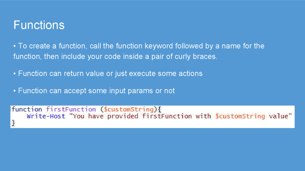 followed by a name for the function, then include your code inside a pair of curly braces. • Function can return value or just execute some actions • Function can accept some input params or not