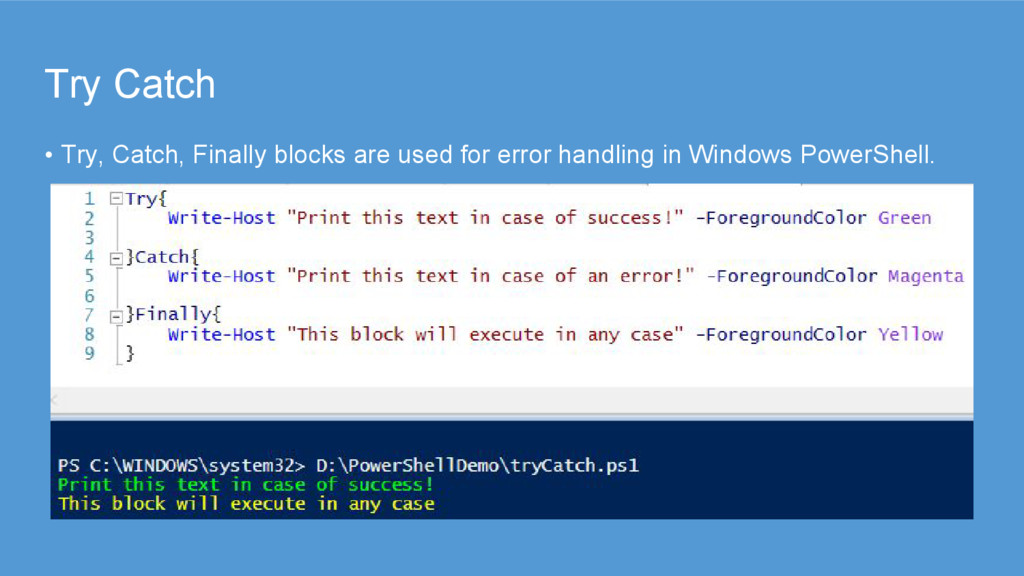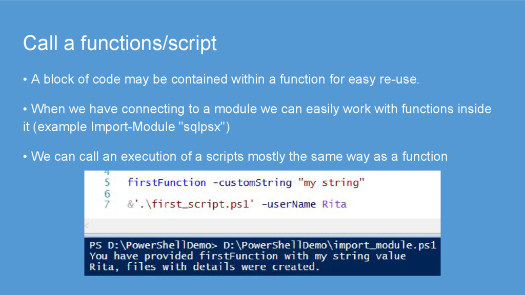 contained within a function for easy re-use. • When we have connecting to a module we can easily work with functions inside it (example Import-Module "sqlpsx") • We can call an execution of a scripts mostly the same way as a function