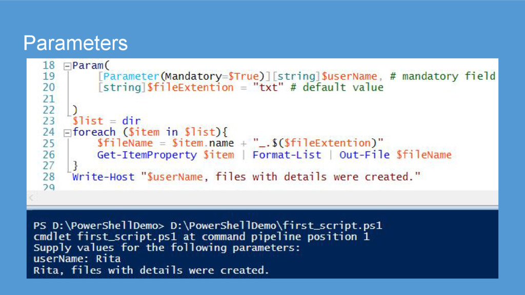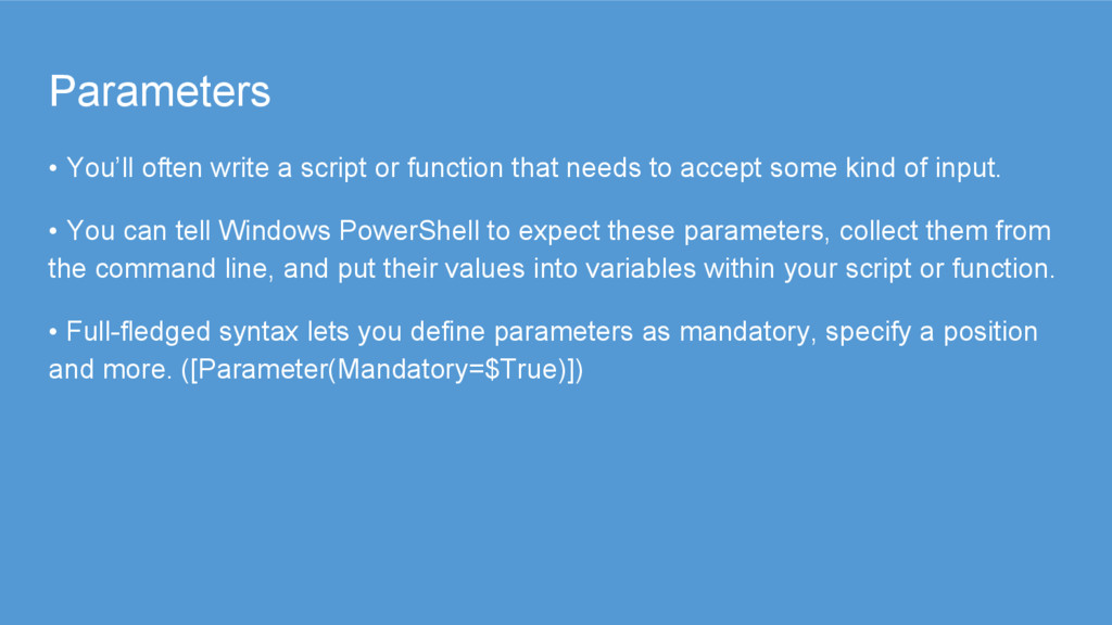 needs to accept some kind of input. • You can tell Windows PowerShell to expect these parameters, collect them from the command line, and put their values into variables within your script or function. • Full-fledged syntax lets you define parameters as mandatory, specify a position and more. ([Parameter(Mandatory=$True)])