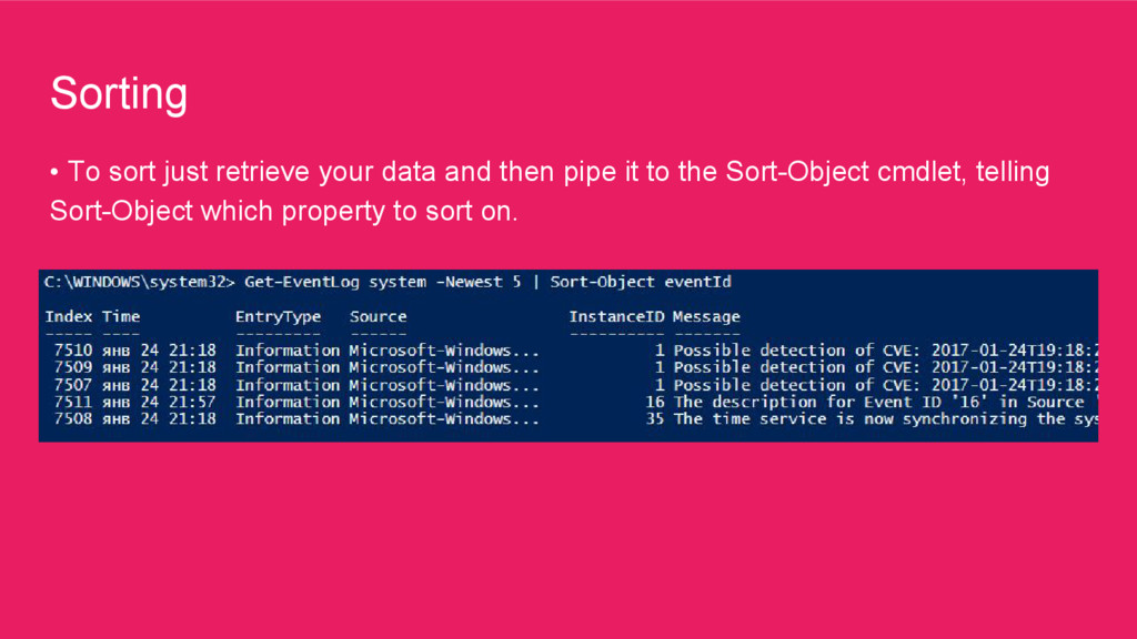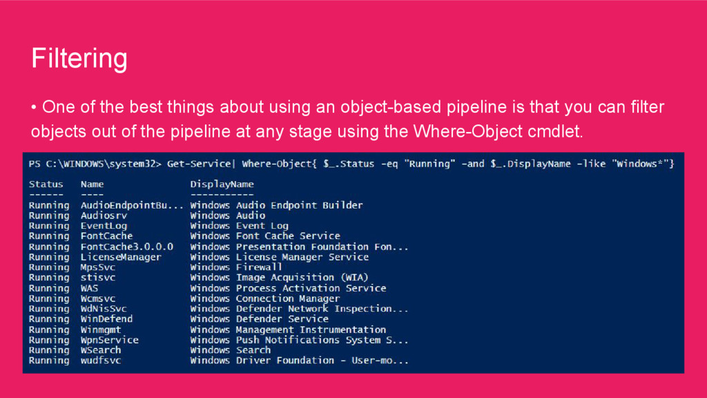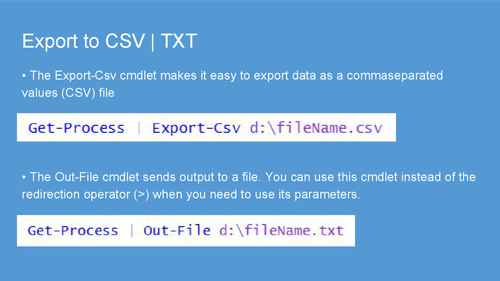 it easy to export data as a commaseparated values (CSV) file • The Out-File cmdlet sends output to a file. You can use this cmdlet instead of the redirection operator (>) when you need to use its parameters.