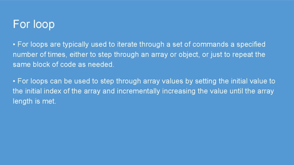 through a set of commands a specified number of times, either to step through an array or object, or just to repeat the same block of code as needed. • For loops can be used to step through array values by setting the initial value to the initial index of the array and incrementally increasing the value until the array length is met.
