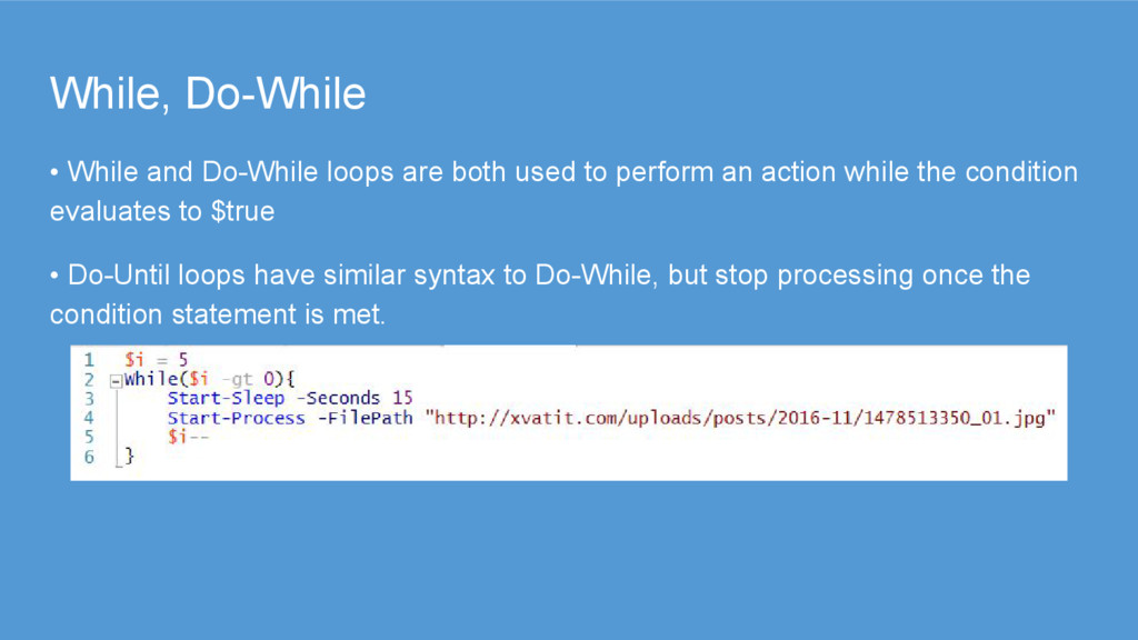 to perform an action while the condition evaluates to $true • Do-Until loops have similar syntax to Do-While, but stop processing once the condition statement is met.