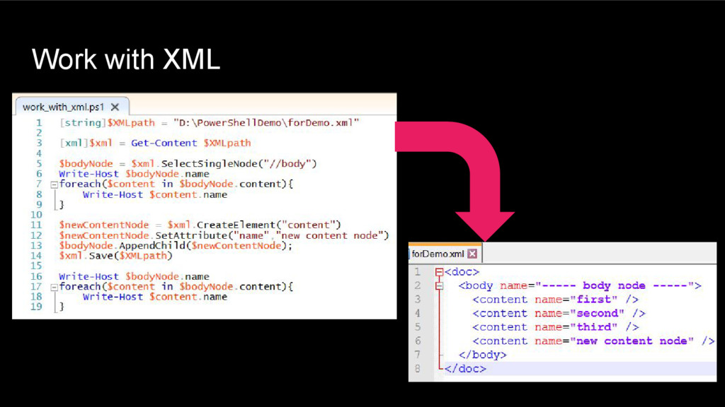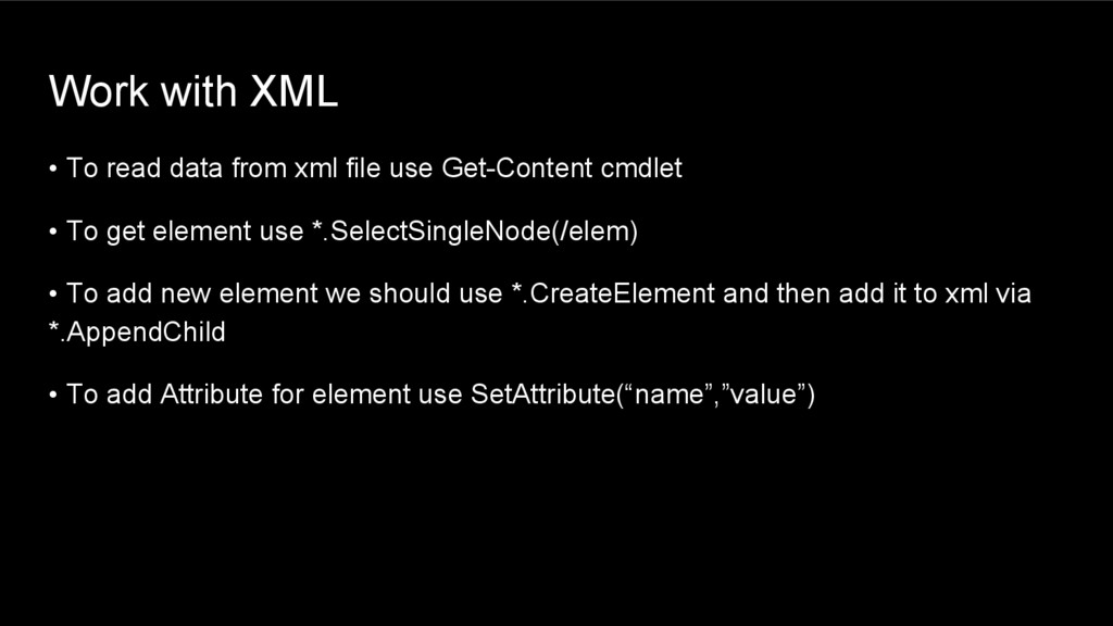 use Get-Content cmdlet • To get element use *.SelectSingleNode(/elem) • To add new element we should use *.CreateElement and then add it to xml via *.AppendChild • To add Attribute for element use SetAttribute(“name”,”value”)