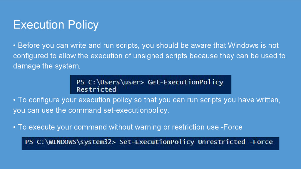 you should be aware that Windows is not configured to allow the execution of unsigned scripts because they can be used to damage the system. • To configure your execution policy so that you can run scripts you have written, you can use the command set-executionpolicy. • To execute your command without warning or restriction use -Force