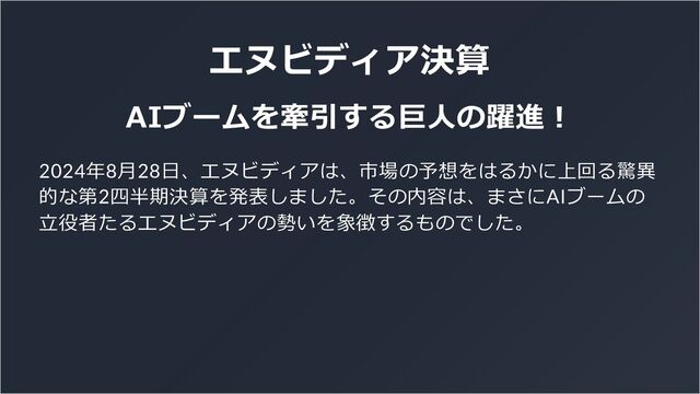 エヌビディア決算 AIブームを牽引する巨人の躍進! 2024年8月28日、エヌビディアは、市場の予想をはるかに上回る驚異 的な第2四半期決算を発表しました。その内容は、まさにAIブームの 立役者たるエヌビディアの勢いを象徴するものでした。