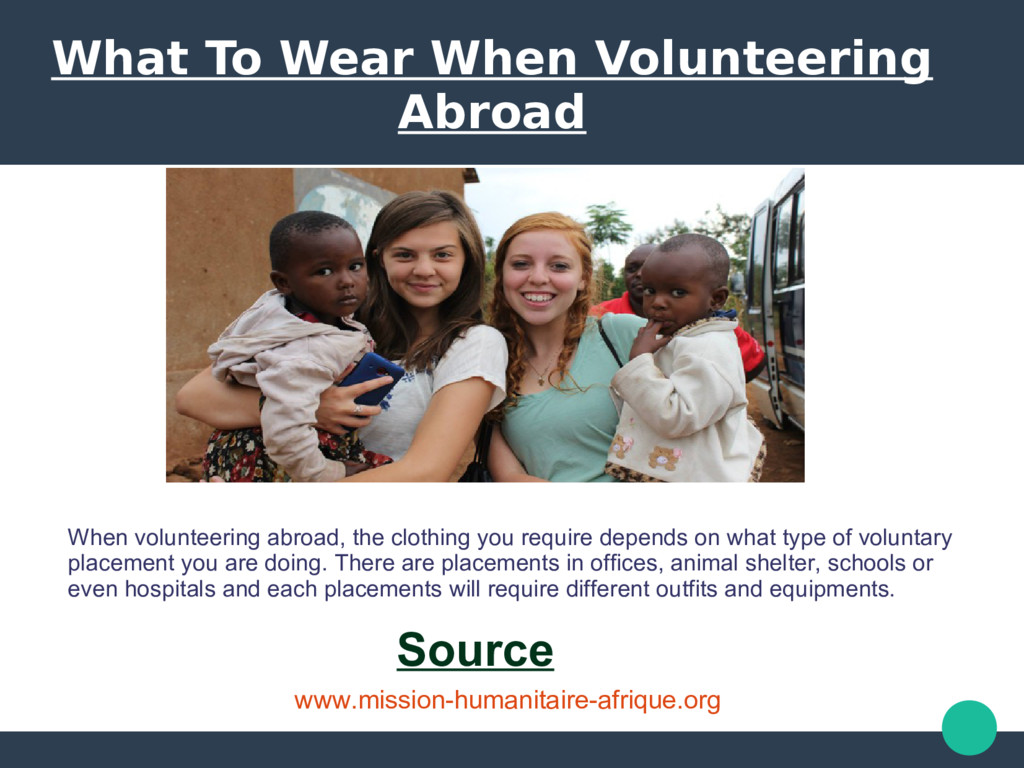 If you are going on a volunteering abroad program, then you must know what type of clothes you need to require for volunteering. Check out here the presentation which describes what to wear when you are planning for volunteering abroad program at different placements.