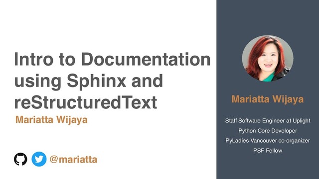 Sphinx: https://docs.readthedocs.io/en/stable/intro/getting-started-with-sphinx.html .. _reStructuredText markup specification: https://docutils.sourceforge.io/docs/ref/rst/restructuredtext.html @mariatta Intro to Documentation using Sphinx and reStructuredText