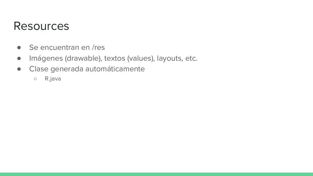 Resources • Se encuentran en /res • Imágenes (drawable), textos