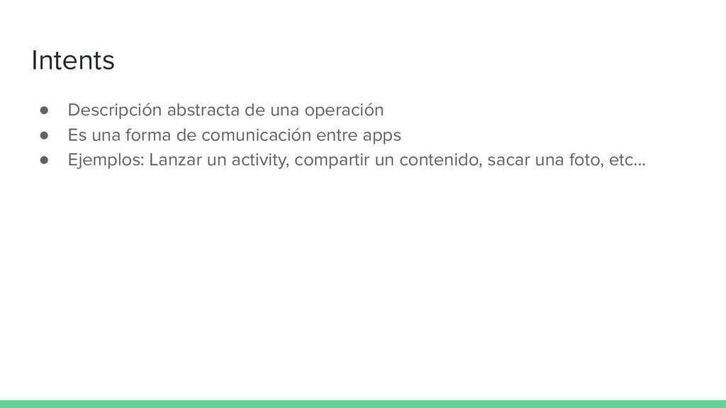 forma de comunicación entre apps • Ejemplos: Lanzar un activity, compartir un contenido, sacar una foto, etc...