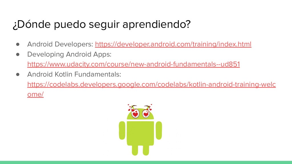 ¿Dónde puedo seguir aprendiendo? • Android Developers: https://developer.android.com/training/index.html • Developing