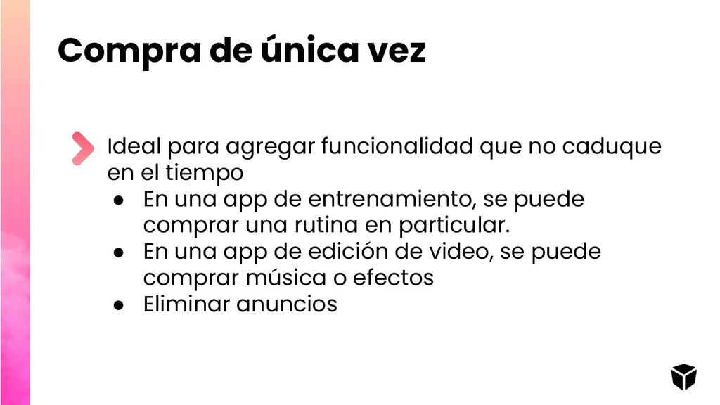 caduque en el tiempo • En una app de entrenamiento, se puede comprar una rutina en particular. • En una app de edición de video, se puede comprar música o efectos • Eliminar anuncios