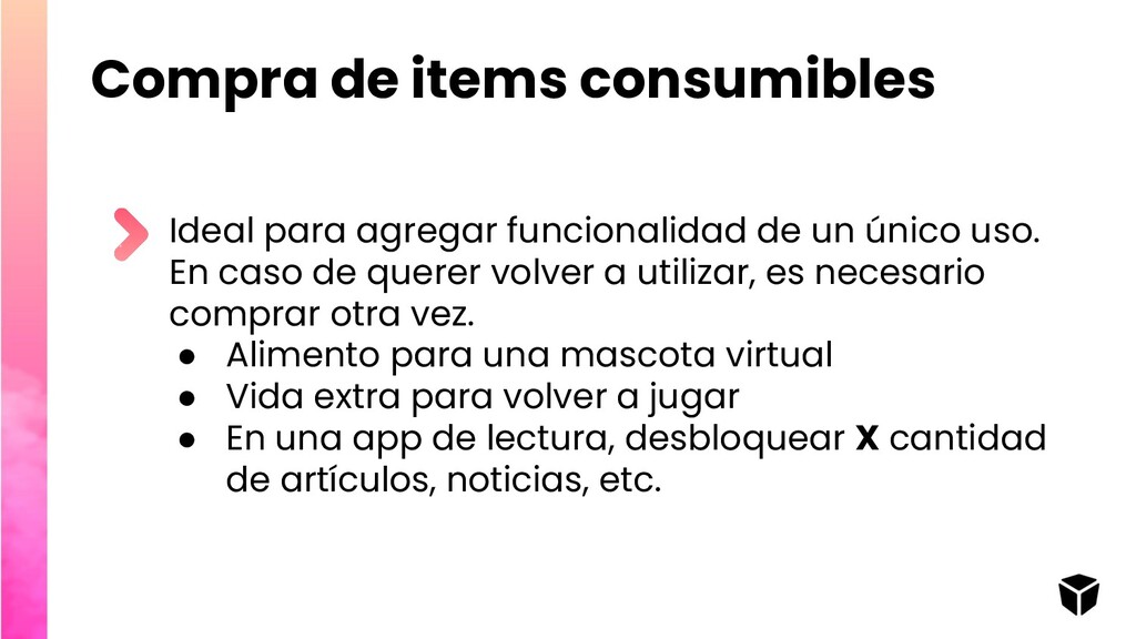 único uso. En caso de querer volver a utilizar, es necesario comprar otra vez. • Alimento para una mascota virtual • Vida extra para volver a jugar • En una app de lectura, desbloquear X cantidad de artículos, noticias, etc.