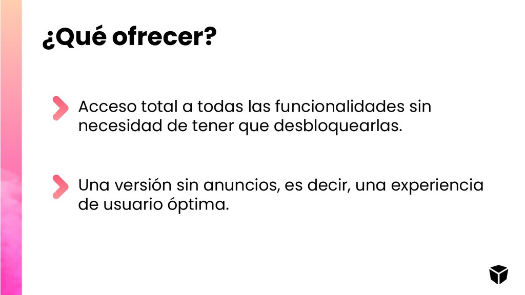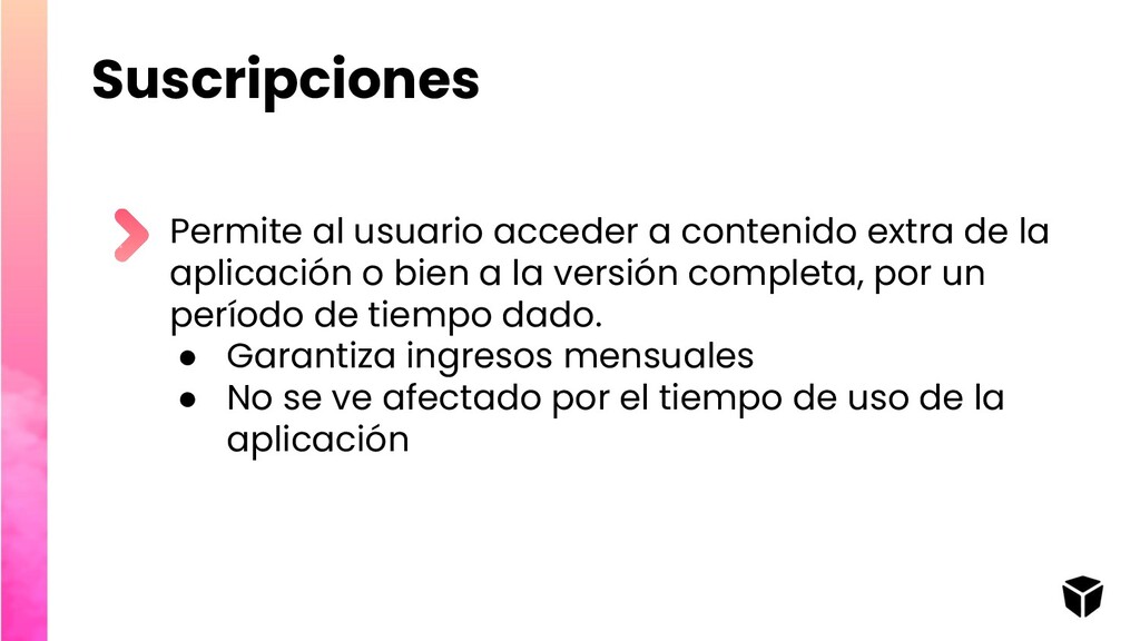 aplicación o bien a la versión completa, por un período de tiempo dado. • Garantiza ingresos mensuales • No se ve afectado por el tiempo de uso de la aplicación