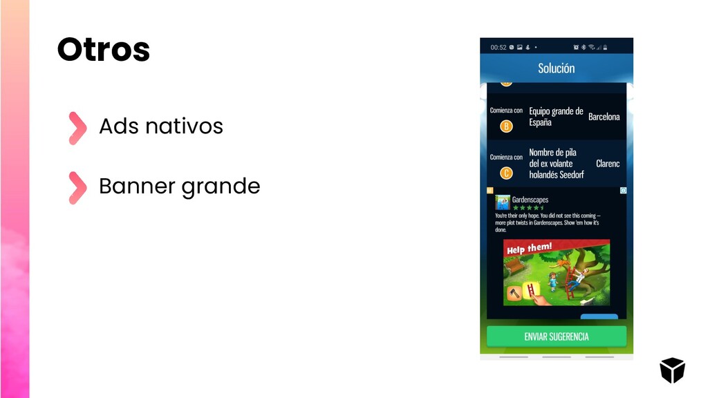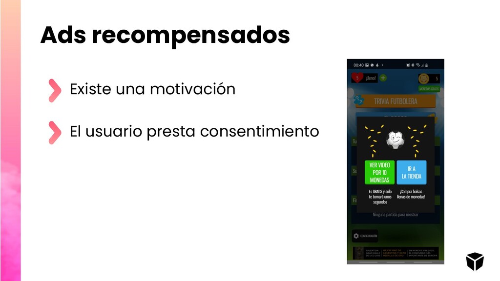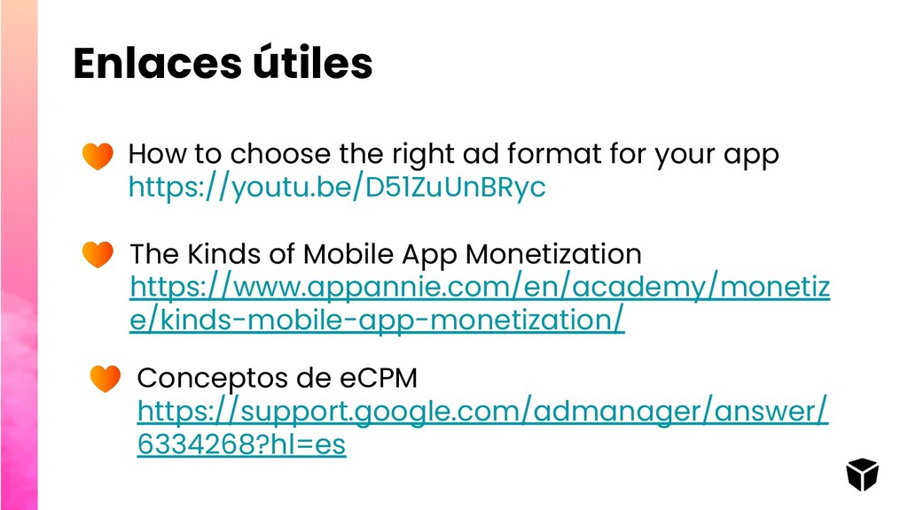 your app https://youtu.be/D51ZuUnBRyc The Kinds of Mobile App Monetization https://www.appannie.com/en/academy/monetiz e/kinds-mobile-app-monetization/ Conceptos de eCPM https://support.google.com/admanager/answer/ 6334268?hl=es