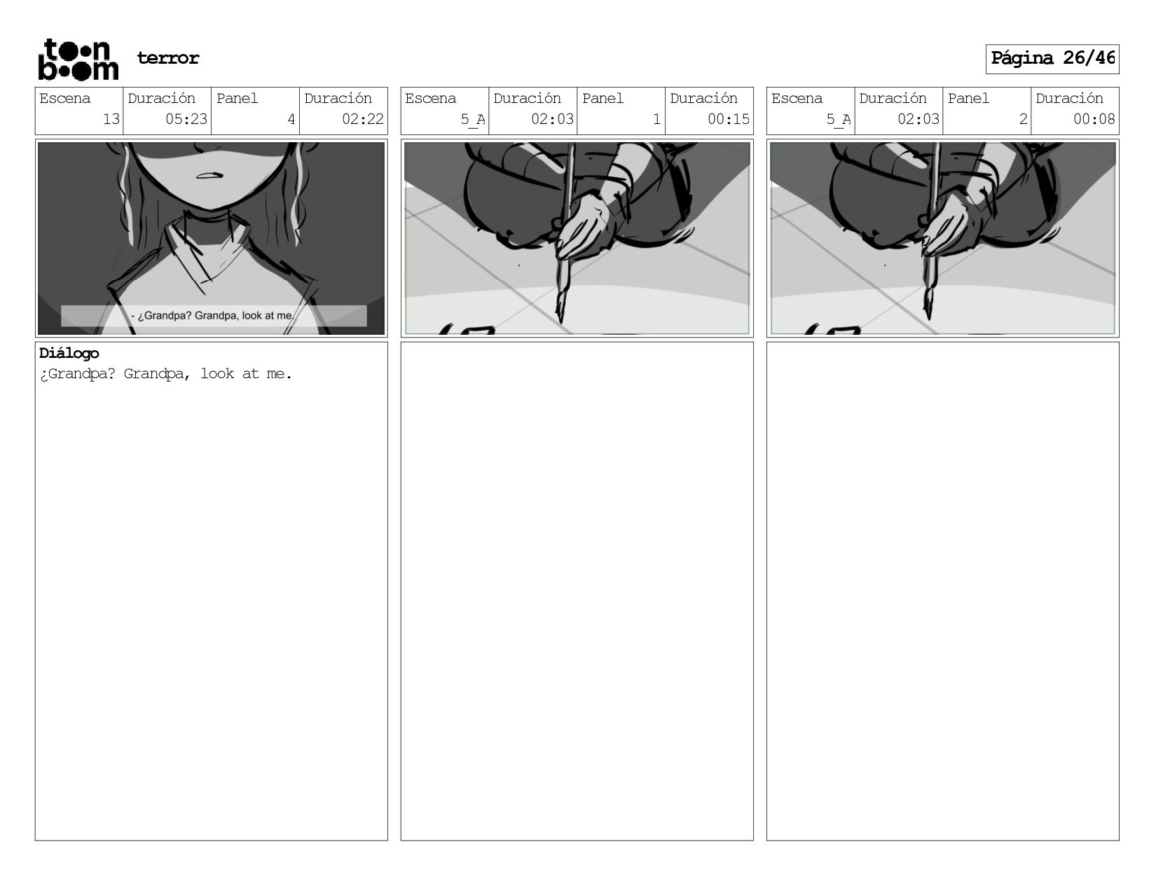 Grandpa, look at me. Escena 5_A Duración 02:03 Panel 1 Duración 00:15 Escena 5_A Duración 02:03 Panel 2 Duración 00:08 terror Página 26/46