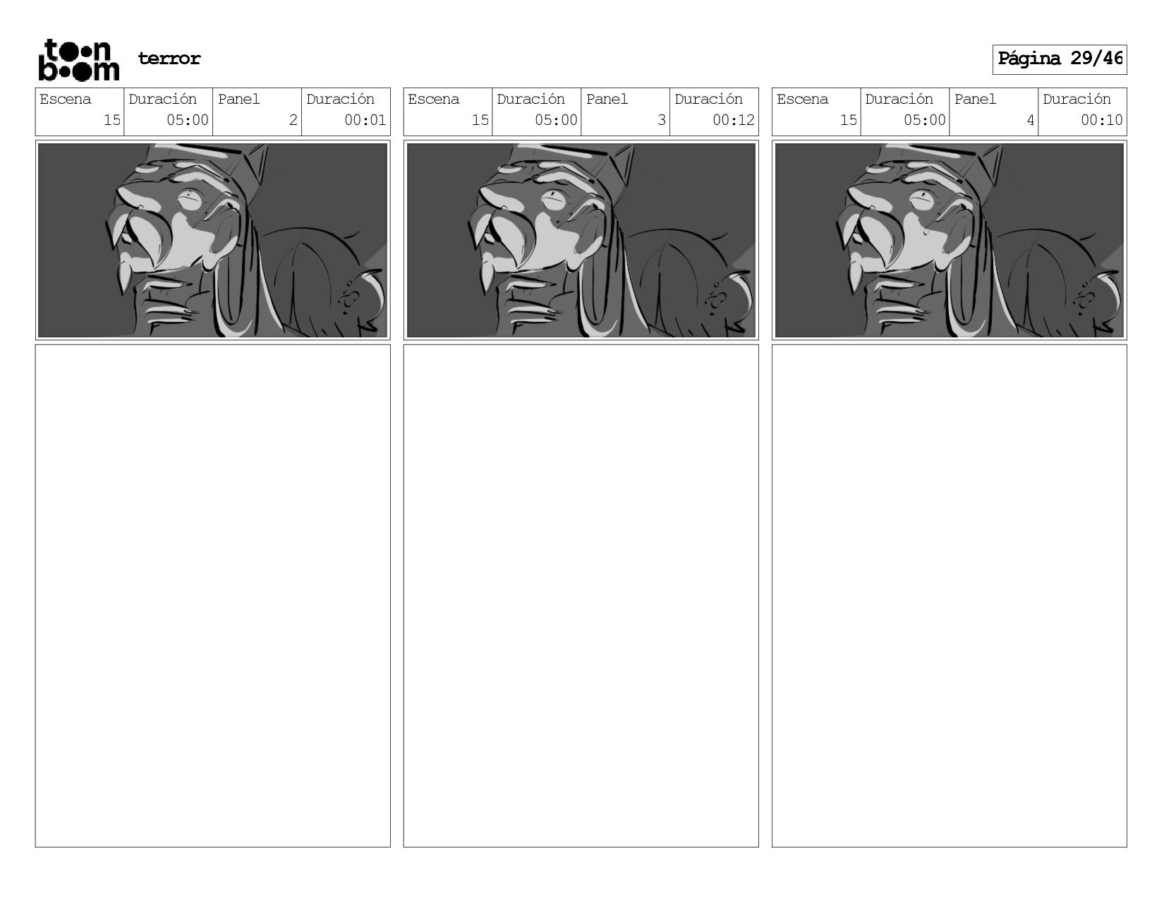 Duración 05:00 Panel 3 Duración 00:12 Escena 15 Duración 05:00 Panel 4 Duración 00:10 terror Página 29/46
