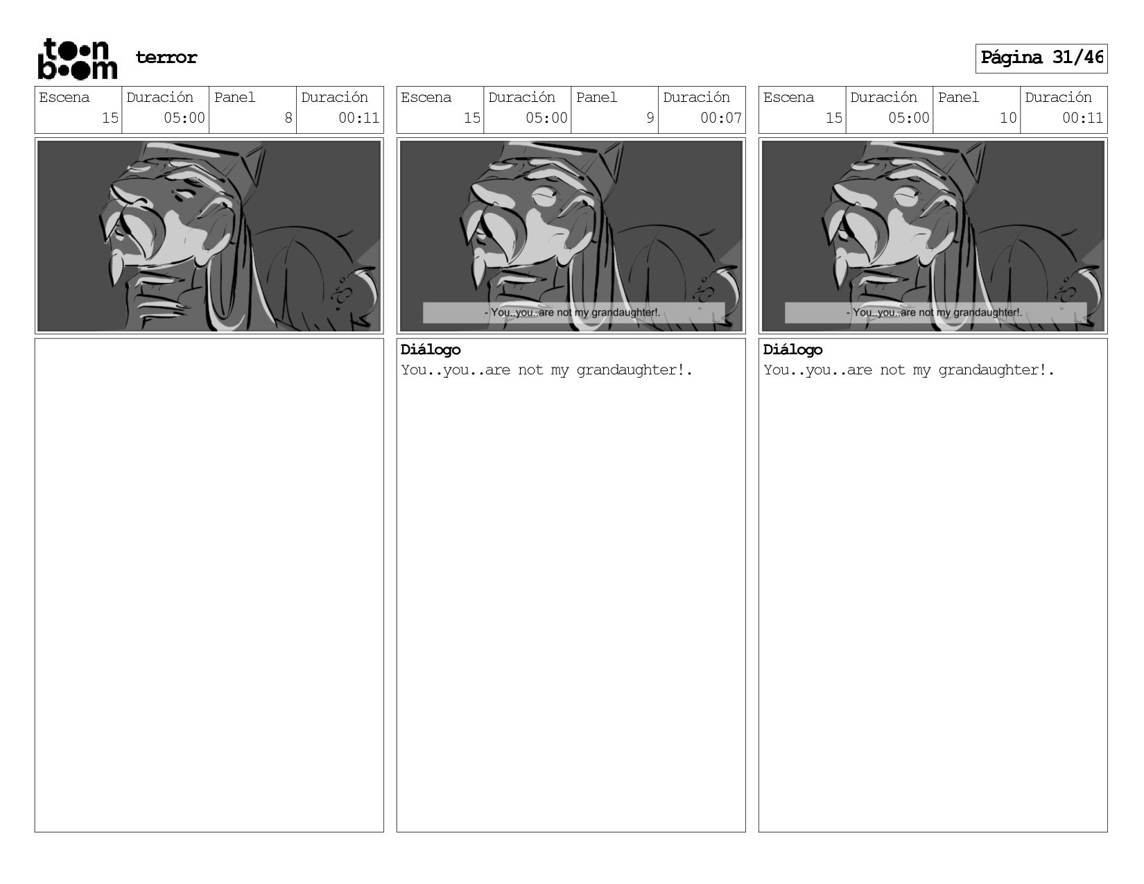 Duración 05:00 Panel 9 Duración 00:07 Diálogo You..you..are not my grandaughter!. Escena 15 Duración 05:00 Panel 10 Duración 00:11 Diálogo You..you..are not my grandaughter!. terror Página 31/46