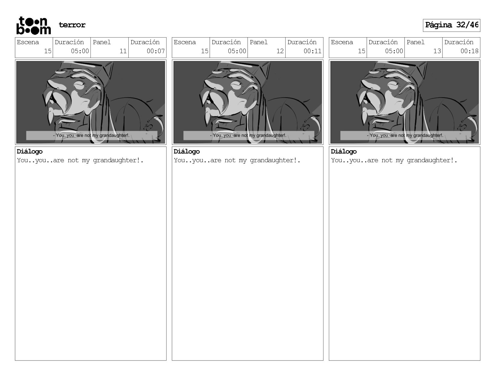 not my grandaughter!. Escena 15 Duración 05:00 Panel 12 Duración 00:11 Diálogo You..you..are not my grandaughter!. Escena 15 Duración 05:00 Panel 13 Duración 00:18 Diálogo You..you..are not my grandaughter!. terror Página 32/46