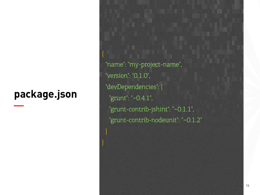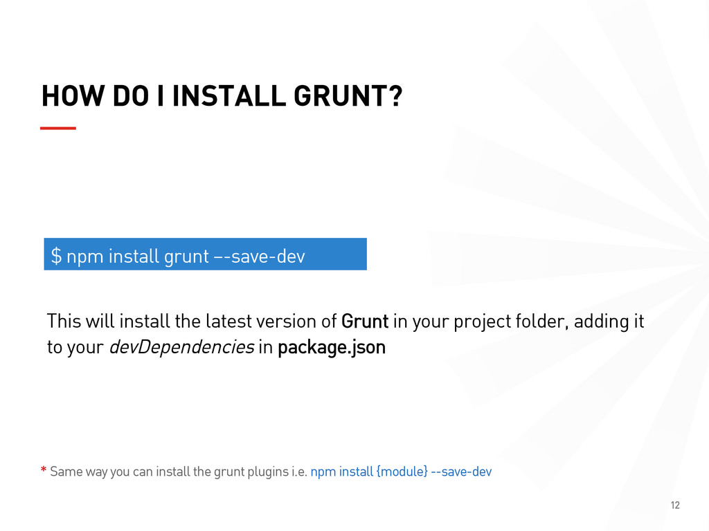 –-save-dev This will install the latest version of Grunt in your project folder, adding it to your devDependencies in package.json * Same way you can install the grunt plugins i.e. npm install {module} --save-dev