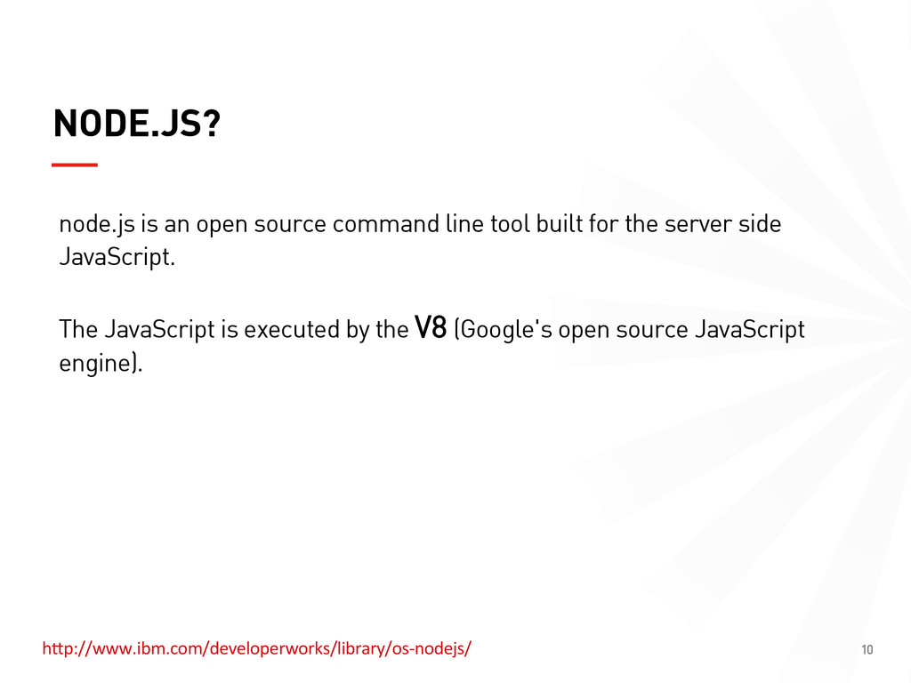 built for the server side JavaScript. The JavaScript is executed by the V8 (Google's open source JavaScript engine). hHp://www.ibm.com/developerworks/library/os-‐nodejs/