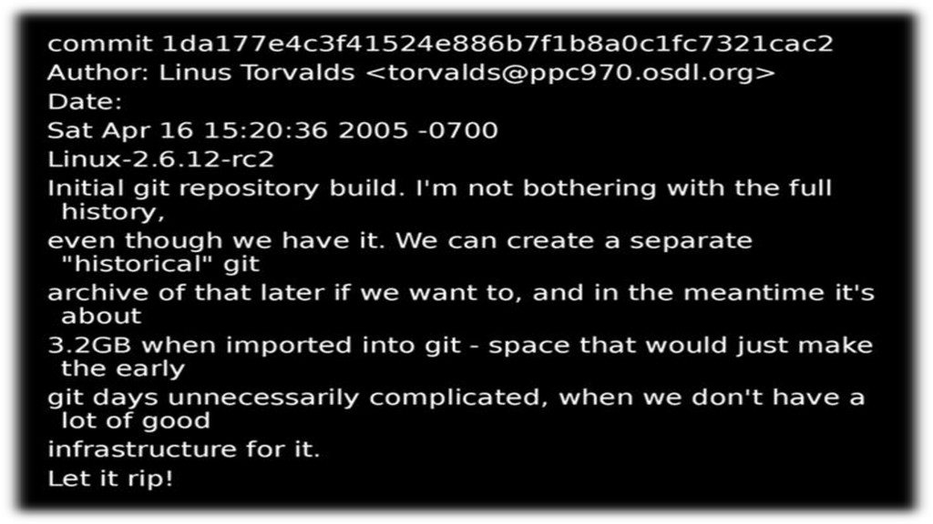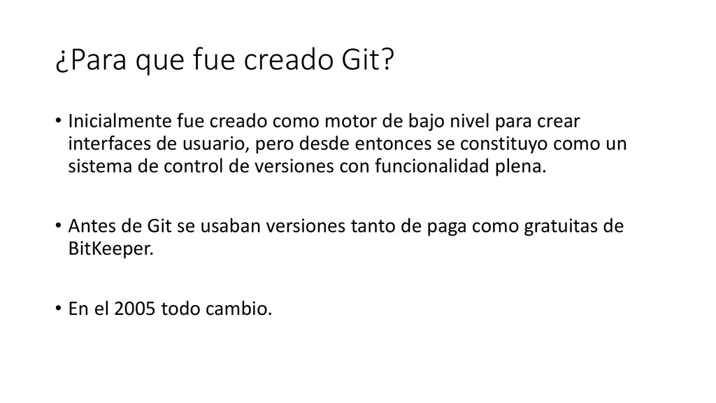 motor de bajo nivel para crear interfaces de usuario, pero desde entonces se constituyo como un sistema de control de versiones con funcionalidad plena. • Antes de Git se usaban versiones tanto de paga como gratuitas de BitKeeper. • En el 2005 todo cambio.