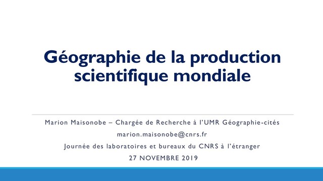 Cette présentation a été réalisée le 27 novembre 2019 à l'occasion de la Journée des laboratoires et bureaux du CNRS à l’étranger. Elle revient sur les principaux résultats de nos recherches sur la géographie mondiale des activités scientifiques puis elle présente NETSCITY, une nouvelle application web en cours de développement pour cartographier la production et les collaborations scientifiques entre villes.