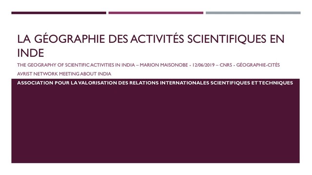 Cette présentation sur la place de l'Inde dans la géographie des activités scientifiques mondiales a été réalisée dans la perspective d'une réunion interne de L'AVRIST, Association pour la Valorisation des Relations Internationales Scientifiques et Techniques . Cette association rassemble depuis 1982 des personnes qui assument ou ont assumé des fonctions de conseiller ou d'attaché scientifique en Ambassade de France, ou toute autre fonction, publique ou privée, à l'étranger, ainsi que des professionnels des relations internationales dans les domaines de la recherche, de la science, de la technologie et de l'industrie.