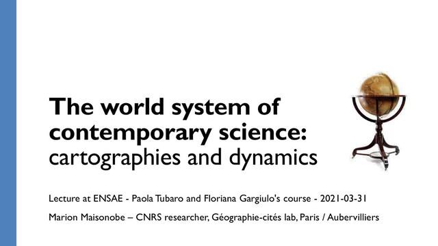 and Guillaume Cabanac. 2020. ‘Spatial Organisation of French Research from the Scholarly Publication Standpoint (1999-2017): Long-Standing Dynamics and Policy-Induced Disorder’. EPJ Web Conf. 244. doi: 10.1051/epjconf/202024401005. Maisonobe, Marion, Laurent Jégou, Nikita Yakimovich, and Guillaume Cabanac. 2019. ‘NETSCITY: A Geospatial Application to Analyse and Map World Scale Production and Collaboration Data between Cities’. in ISSI’19: 17th International Conference on Scientometrics and Informetrics. Rome. Maisonobe, Marion, Laurent Jégou, and Guillaume Cabanac. 2018. ‘Peripheral Forces’. Nature Index (563):S18–19. Maisonobe, Marion, Michel Grossetti, Béatrice Milard, Laurent Jégou, and Denis Eckert. 2017. ‘The Global Geography of Scientific Visibility: A Deconcentration Process (1999–2011)’. Scientometrics 113(1):479–93. Maisonobe, M., Grossetti, M., Milard, B., Eckert, D., & Jégou, L. (2016). The global evolution of scientific collaboration networks between cities (1999–2014): Multiple scales. Revue Française de Sociologie, 57(3), 417–441. https://doi.org/10.3917/rfs.573.0417 • ANY QUESTIONS ? Contact: marion.maisonobe<at>cnrs.fr