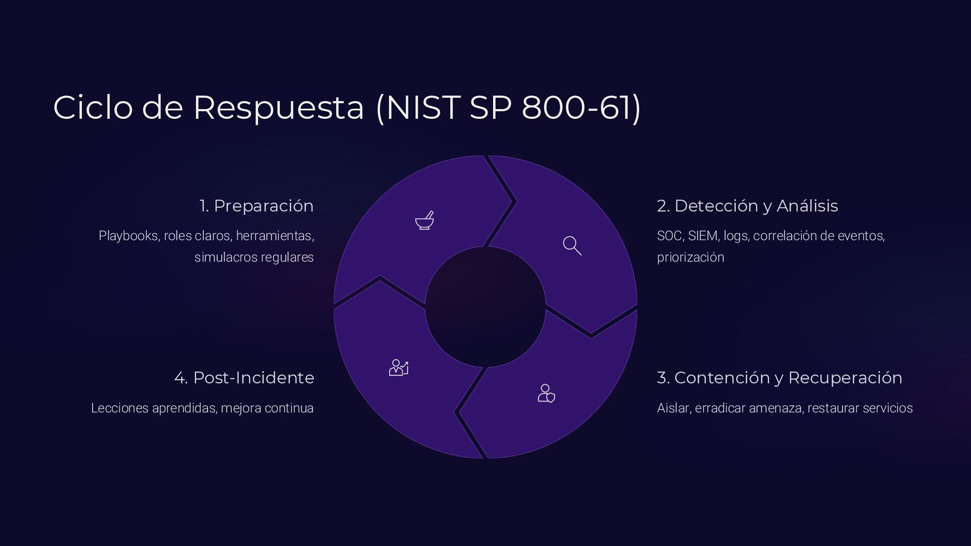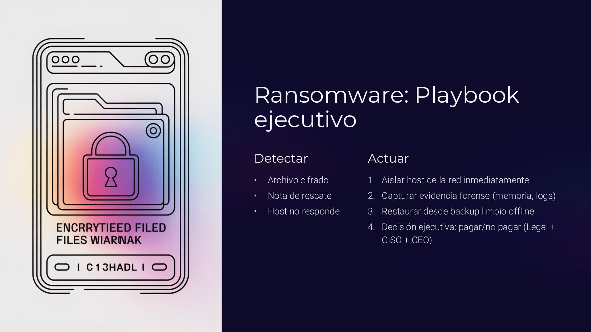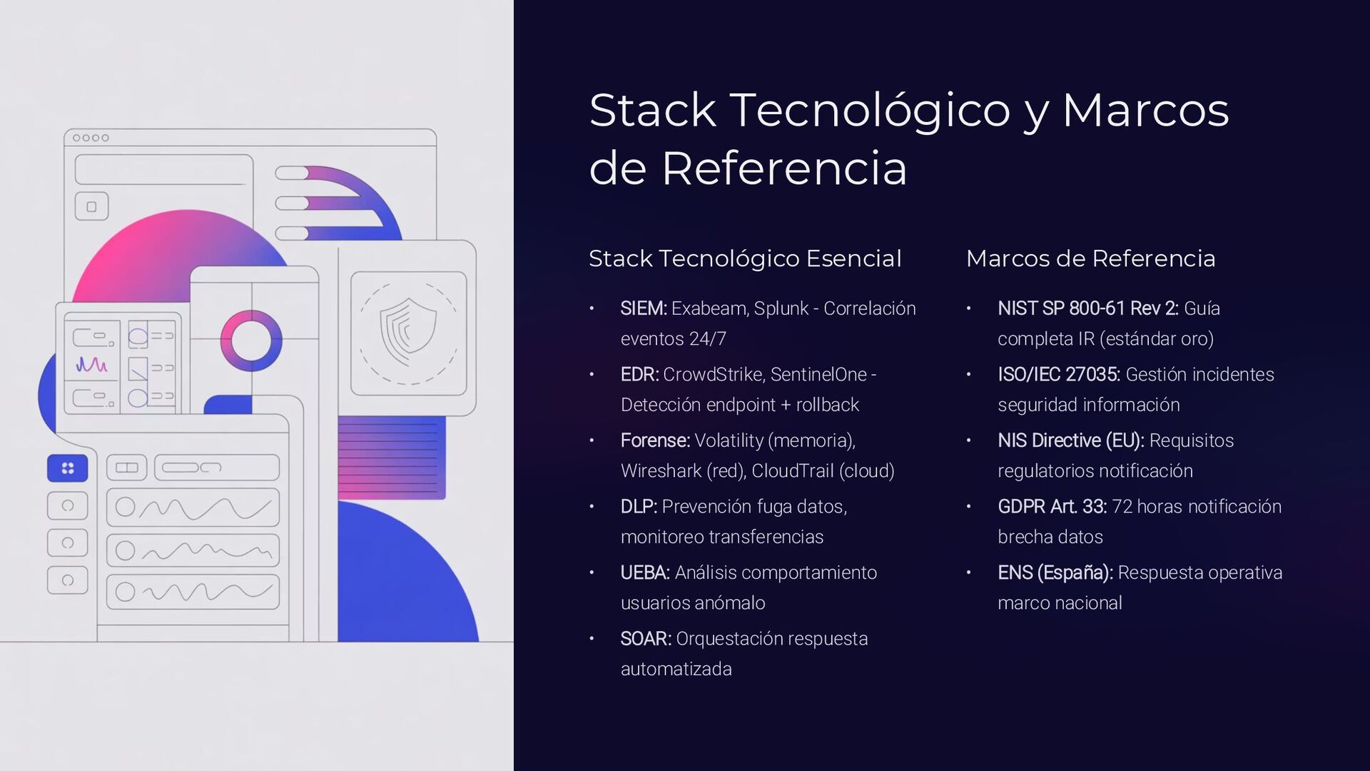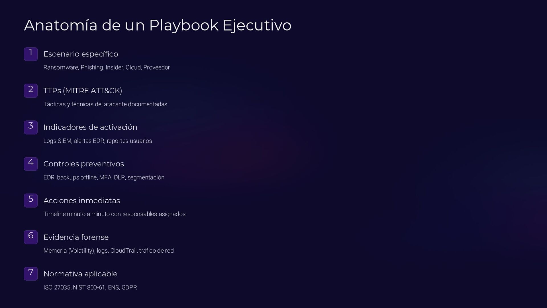 Insider, Cloud, Proveedor 2 TTPs (MITRE ATT&CK) Tácticas y técnicas del atacante documentadas 3 Indicadores de activación Logs SIEM, alertas EDR, reportes usuarios 4 Controles preventivos EDR, backups offline, MFA, DLP, segmentación 5 Acciones inmediatas Timeline minuto a minuto con responsables asignados 6 Evidencia forense Memoria (Volatility), logs, CloudTrail, tráfico de red 7 Normativa aplicable ISO 27035, NIST 800-61, ENS, GDPR