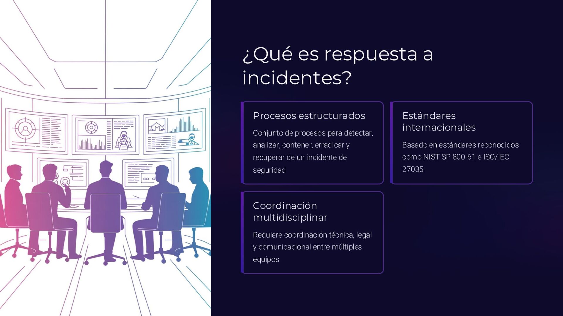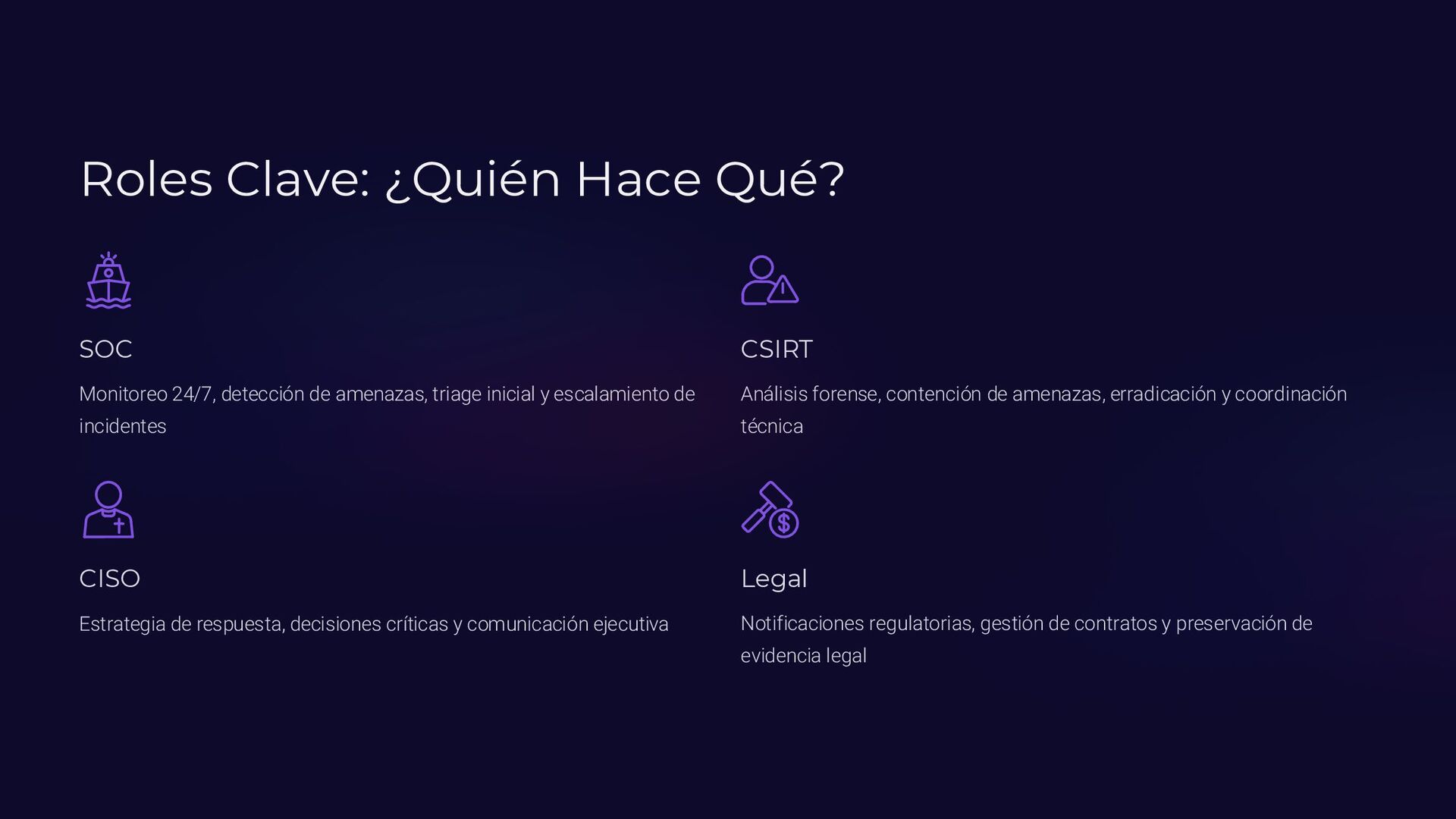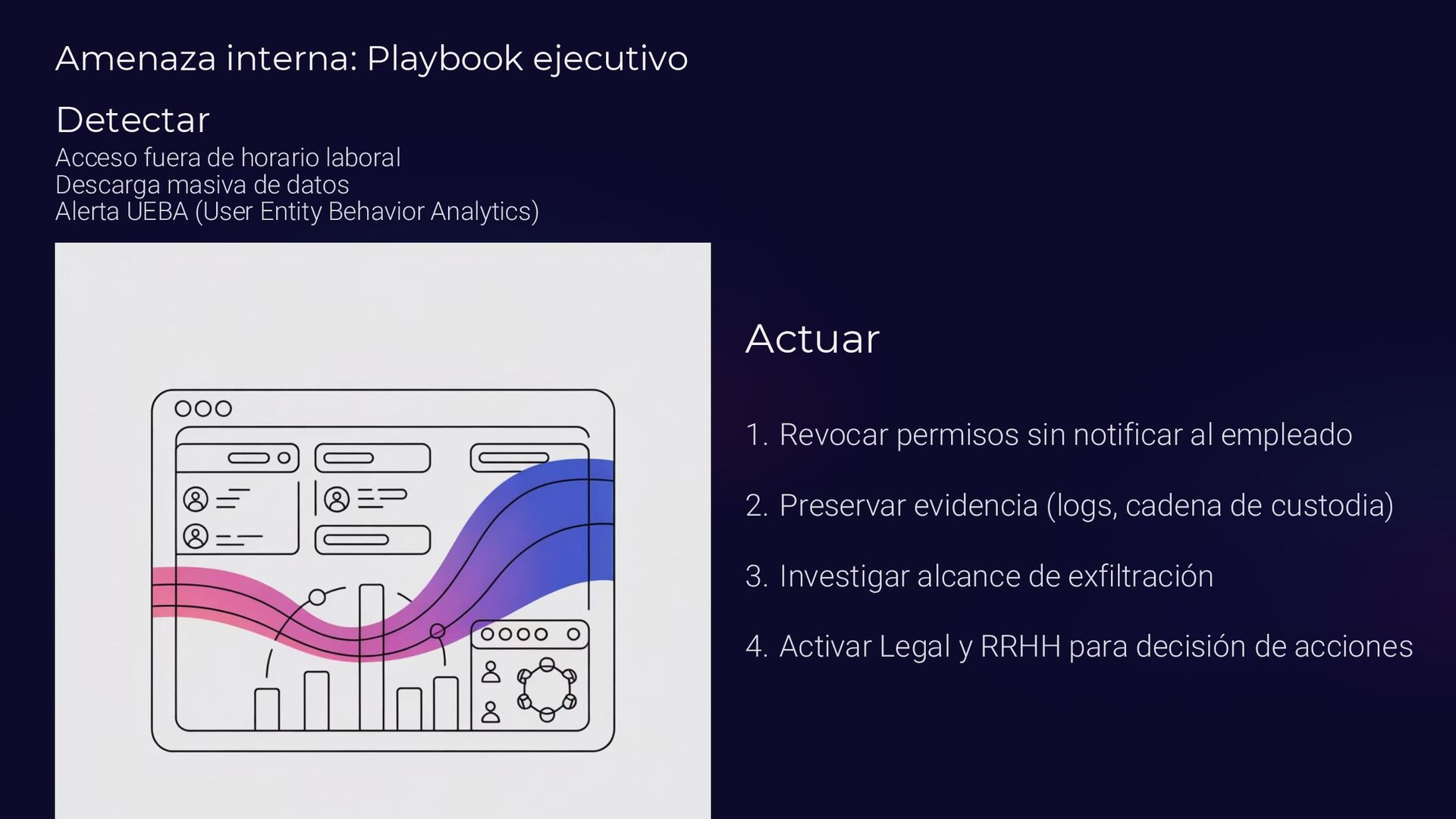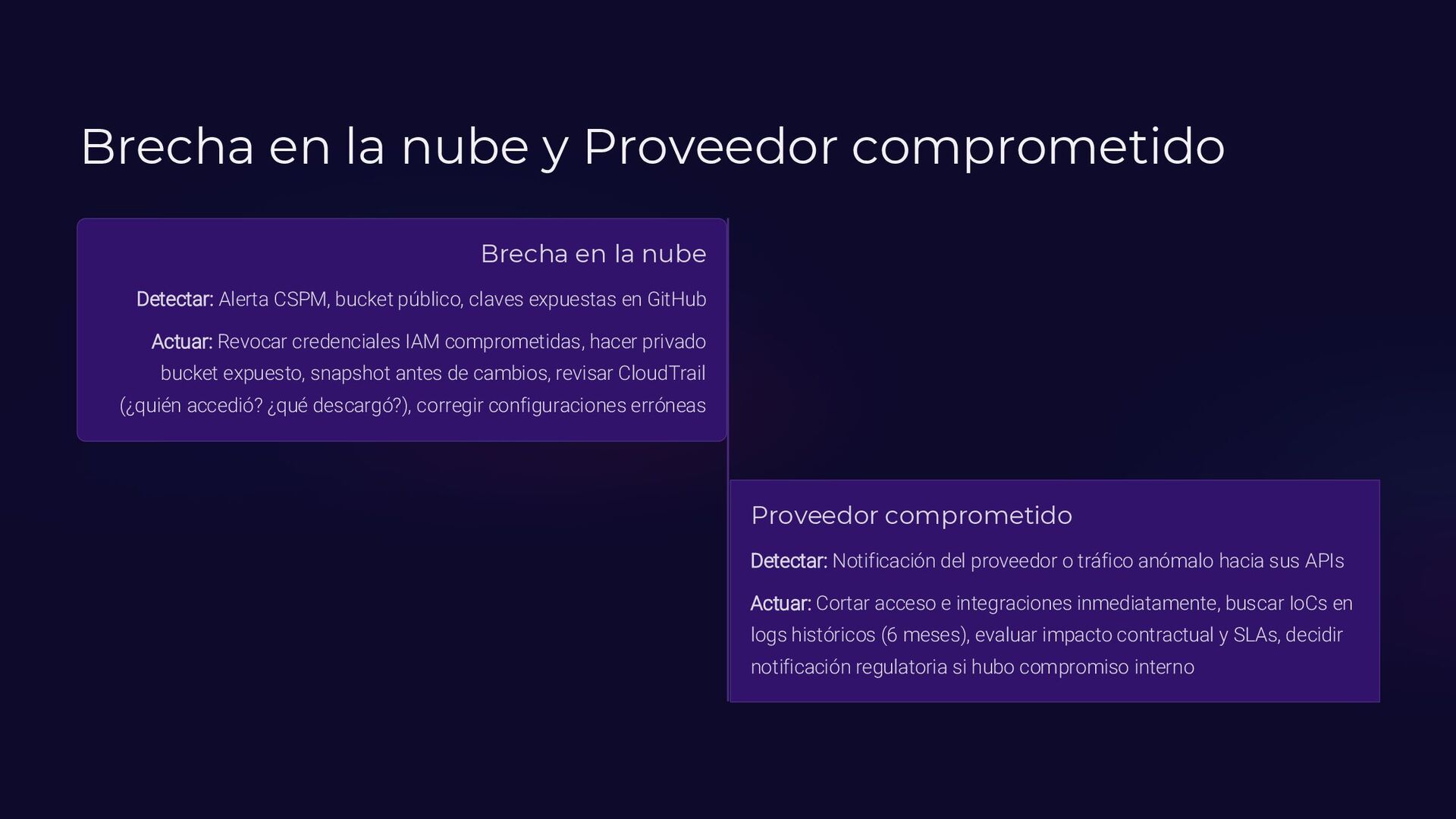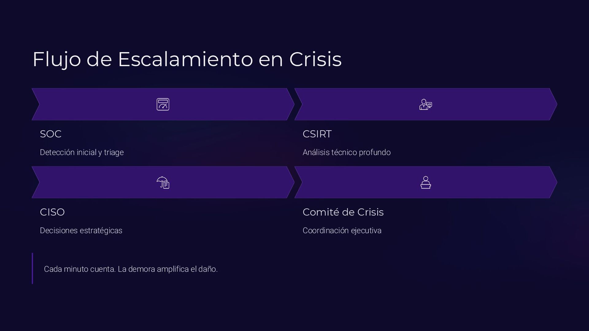 Insider, Cloud, Proveedor 2 TTPs (MITRE ATT&CK) Tácticas y técnicas del atacante documentadas 3 Indicadores de activación Logs SIEM, alertas EDR, reportes usuarios 4 Controles preventivos EDR, backups offline, MFA, DLP, segmentación 5 Acciones inmediatas Timeline minuto a minuto con responsables asignados 6 Evidencia forense Memoria (Volatility), logs, CloudTrail, tráfico de red 7 Normativa aplicable ISO 27035, NIST 800-61, ENS, GDPR