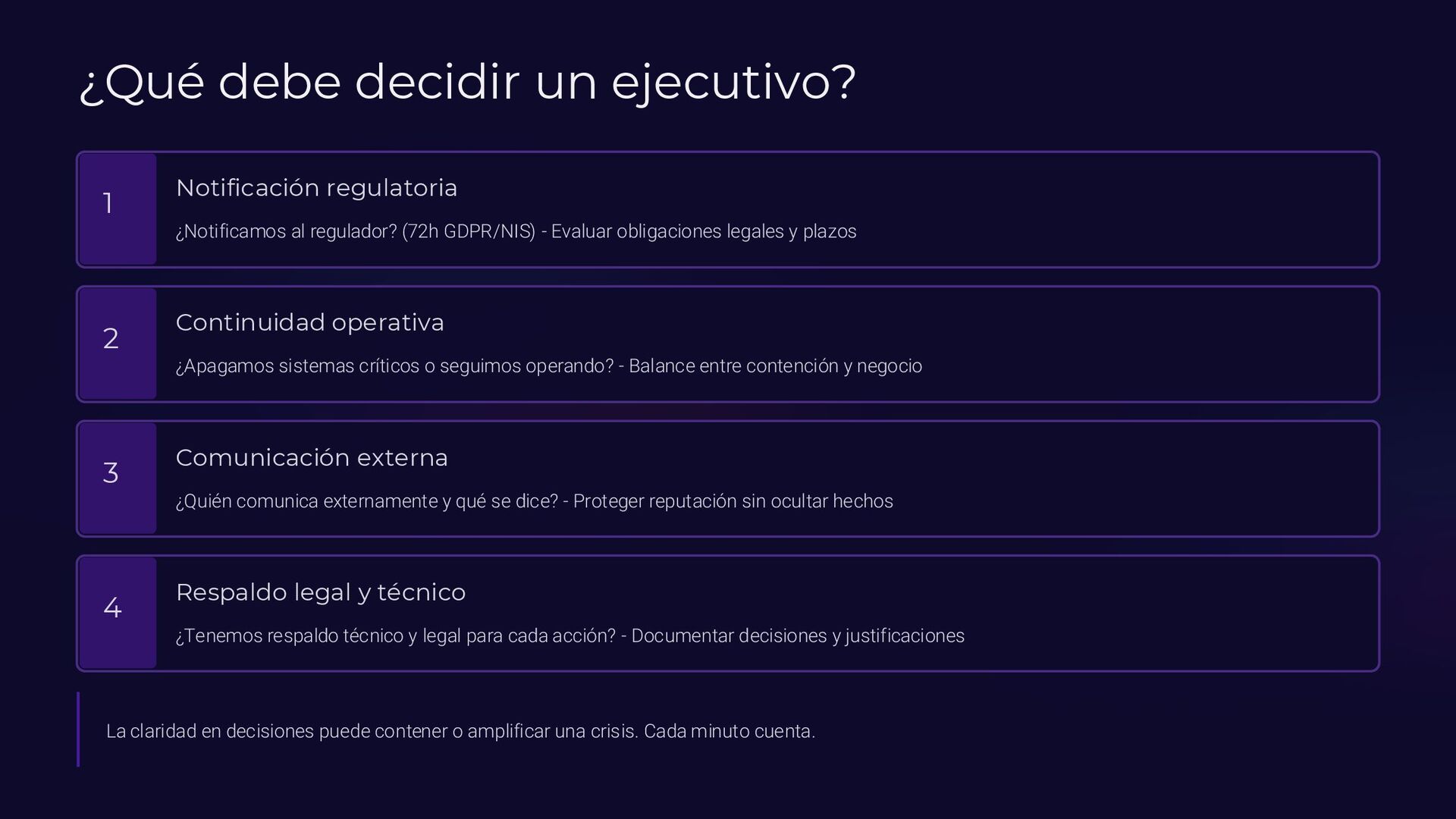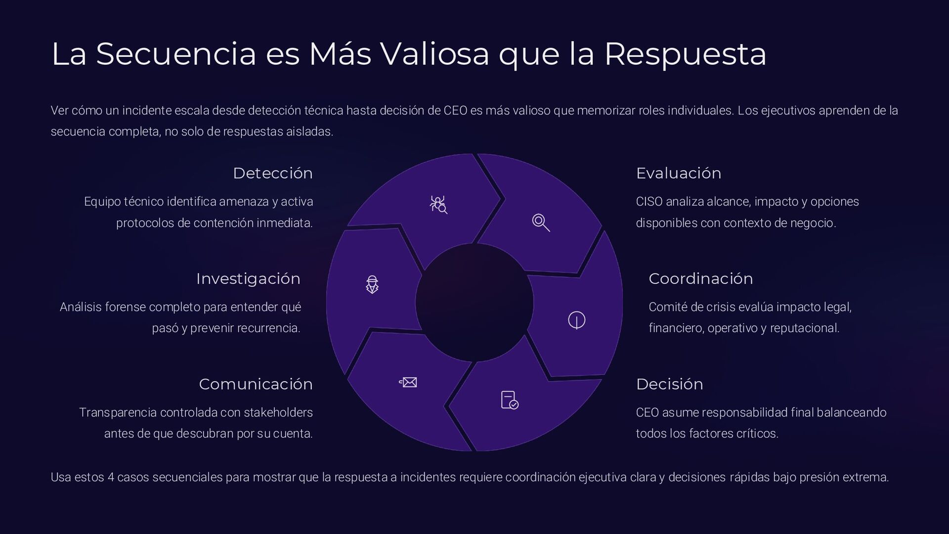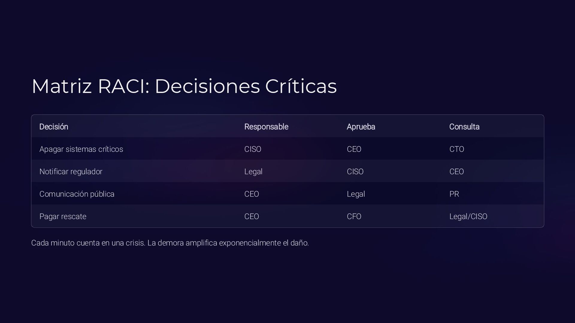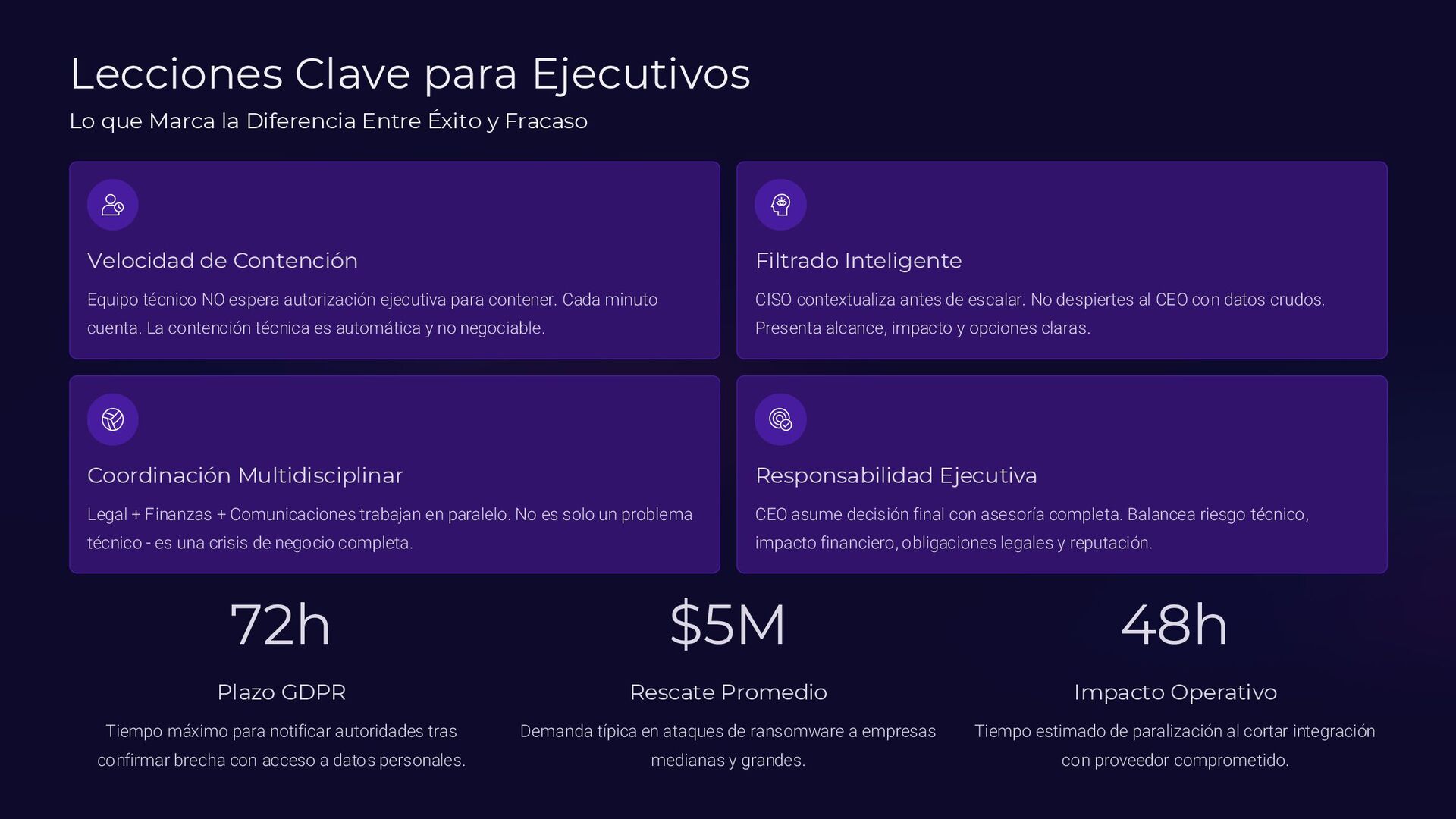 Insider, Cloud, Proveedor 2 TTPs (MITRE ATT&CK) Tácticas y técnicas del atacante documentadas 3 Indicadores de activación Logs SIEM, alertas EDR, reportes usuarios 4 Controles preventivos EDR, backups offline, MFA, DLP, segmentación 5 Acciones inmediatas Timeline minuto a minuto con responsables asignados 6 Evidencia forense Memoria (Volatility), logs, CloudTrail, tráfico de red 7 Normativa aplicable ISO 27035, NIST 800-61, ENS, GDPR