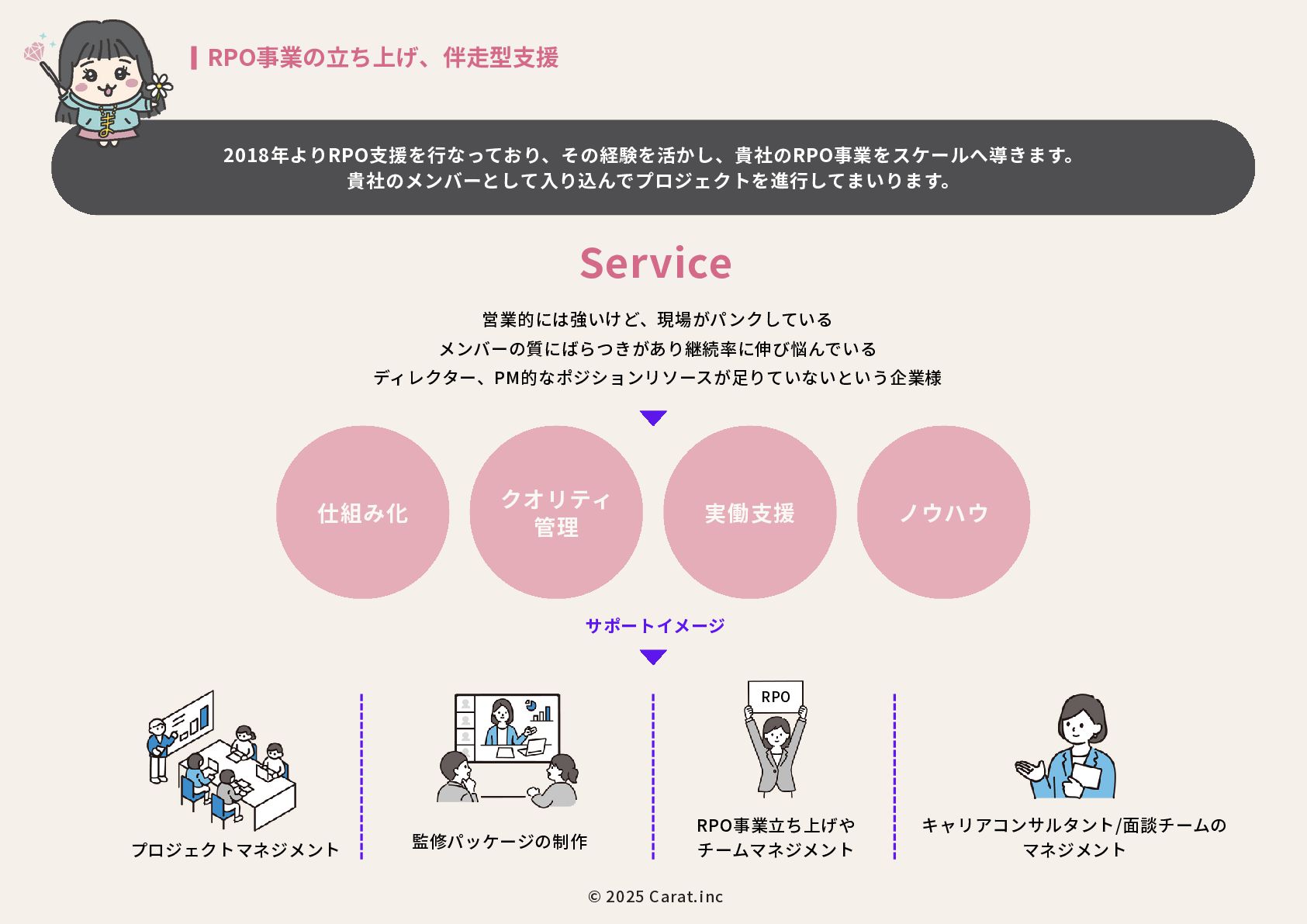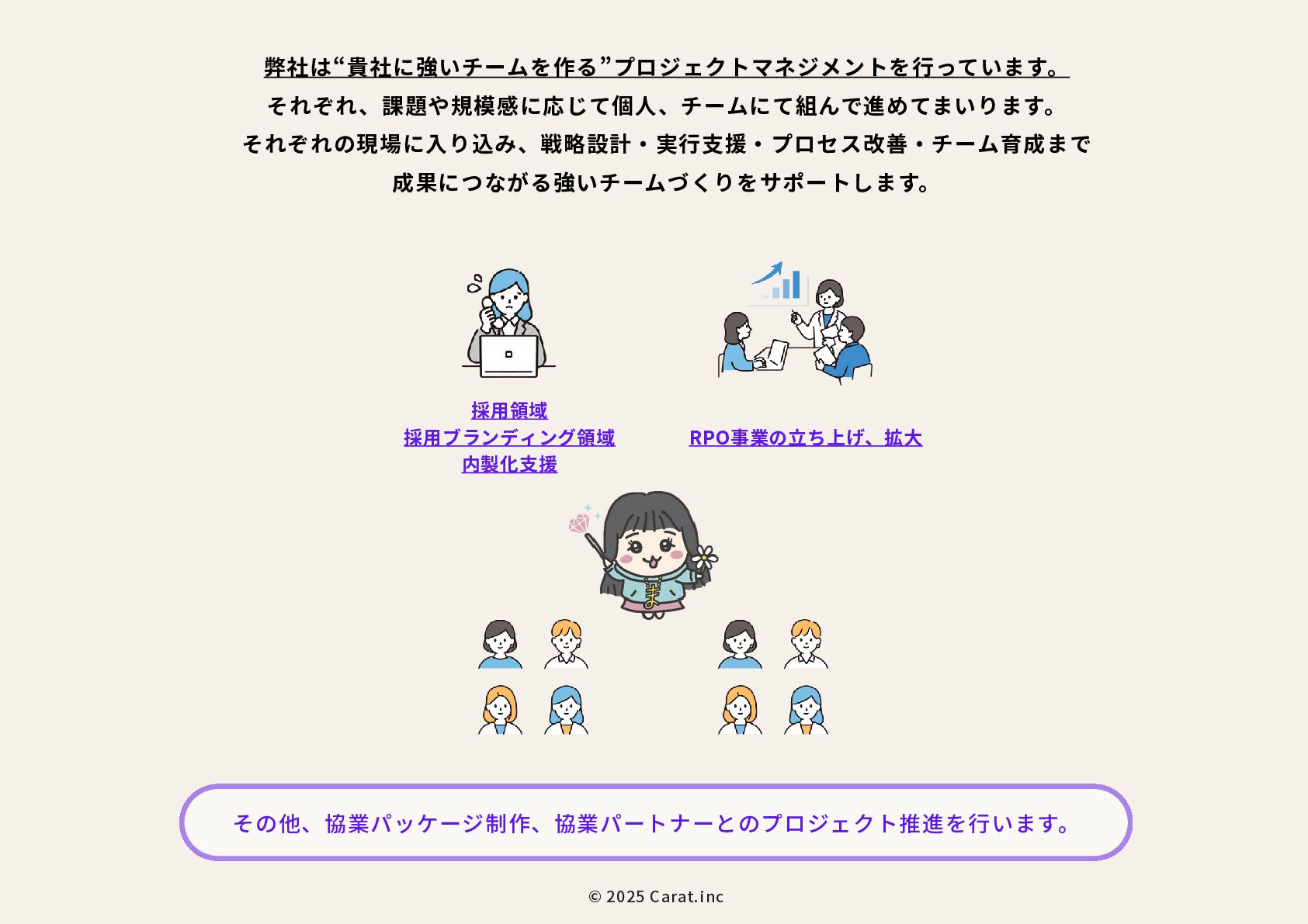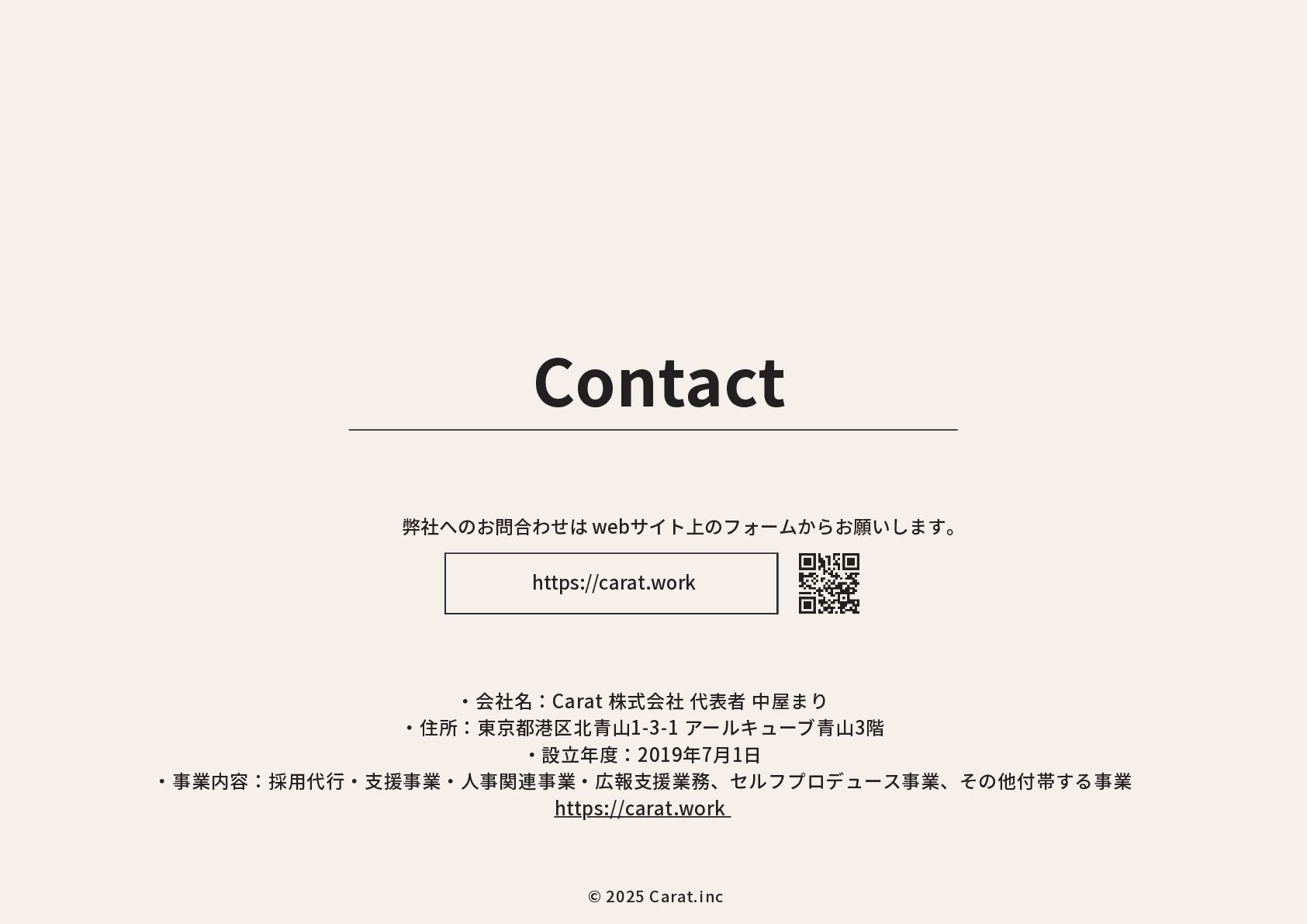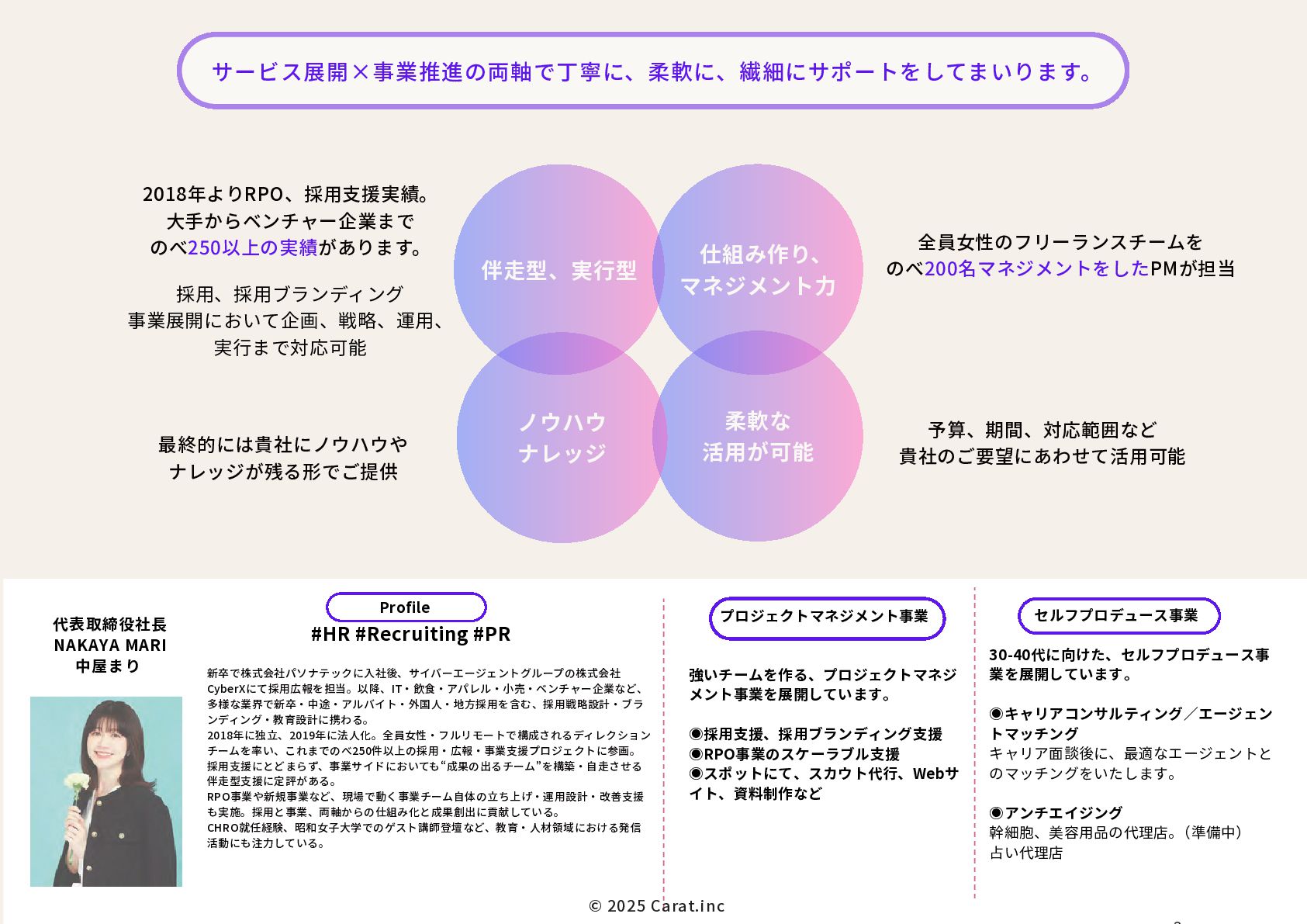 全員女性のフリーランスチームを のべ200名マネジメントをしたPMが担当 代表取締役社長 NAKAYA MARI 中屋まり Profile #HR #Recruiting #PR 新卒で株式会社パソナテックに入社後、サイバーエージェントグループの株式会社 CyberXにて採用広報を担当。以降、IT・飲食・アパレル・小売・ベンチャー企業など、 多様な業界で新卒・中途・アルバイト・外国人・地方採用を含む、採用戦略設計・ブラ ンディング・教育設計に携わる。 2018年に独立、2019年に法人化。全員女性・フルリモートで構成されるディレクション チームを率い、これまでのべ250件以上の採用・広報・事業支援プロジェクトに参画。 採用支援にとどまらず、事業サイドにおいても“成果の出るチーム”を構築・自走させる 伴走型支援に定評がある。 RPO事業や新規事業など、現場で動く事業チーム自体の立ち上げ・運用設計・改善支援 も実施。採用と事業、両軸からの仕組み化と成果創出に貢献している。 CHRO就任経験、昭和女子大学でのゲスト講師登壇など、教育・人材領域における発信 活動にも注力している。 予算、期間、対応範囲など 貴社のご要望にあわせて活用可能 採用、採用ブランディング 事業展開において企画、戦略、運用、 実行まで対応可能 最終的には貴社にノウハウや ナレッジが残る形でご提供 © 2025 Carat.inc サービス展開×事業推進の両軸で丁寧に、柔軟に、繊細にサポートをしてまいります。 セルフプロデュース事業 30-40代に向けた、セルフプロデュース事 業を展開しています。 ◉キャリアコンサルティング/エージェン トマッチング キャリア面談後に、最適なエージェントと のマッチングをいたします。 ◉アンチエイジング 幹細胞、美容用品の代理店。 (準備中) 占い代理店 プロジェクトマネジメント事業 強いチームを作る、プロジェクトマネジ メント事業を展開しています。 ◉採用支援、採用ブランディング支援 ◉RPO事業のスケーラブル支援 ◉スポットにて、スカウト代行、Webサ イト、資料制作など