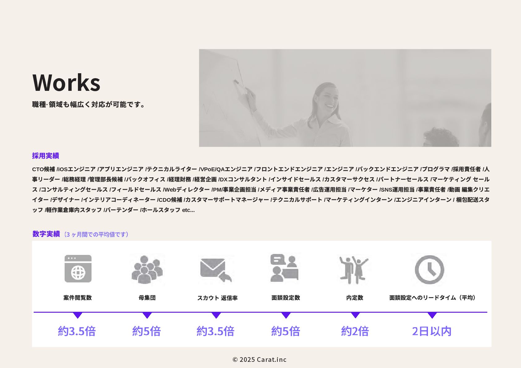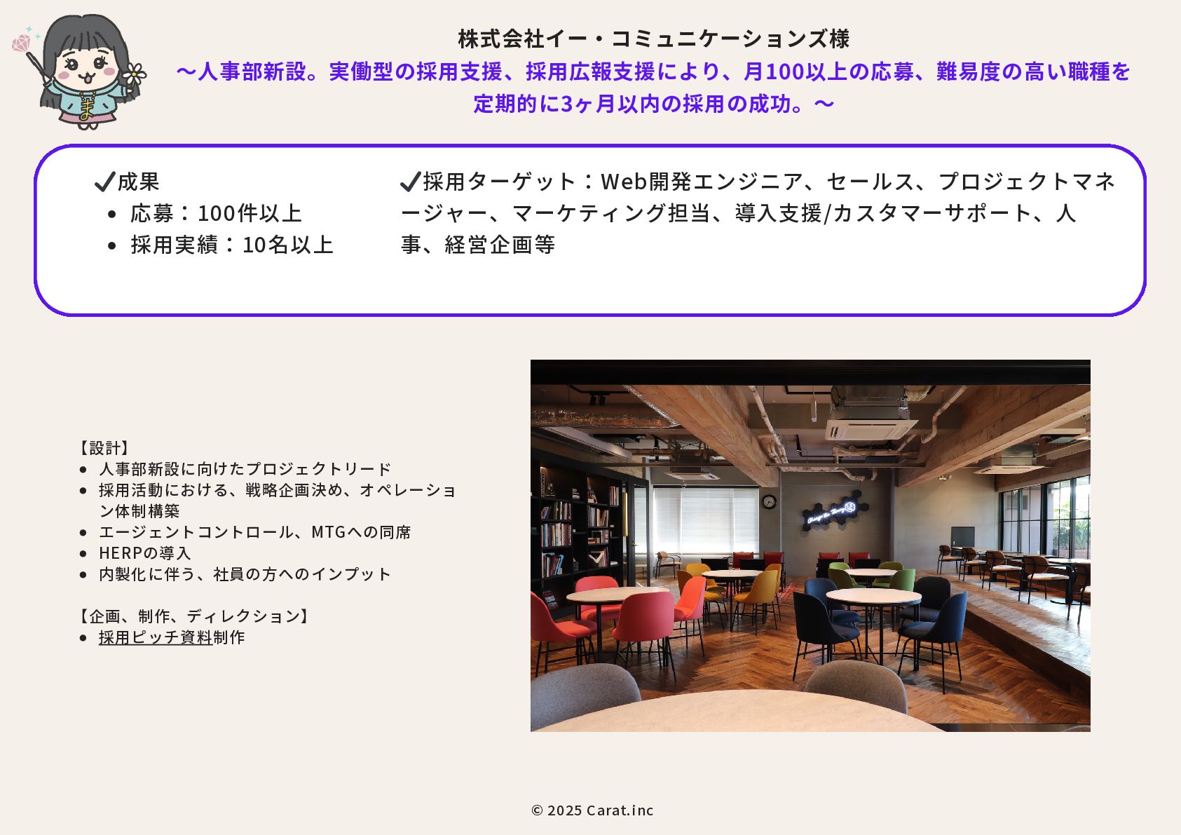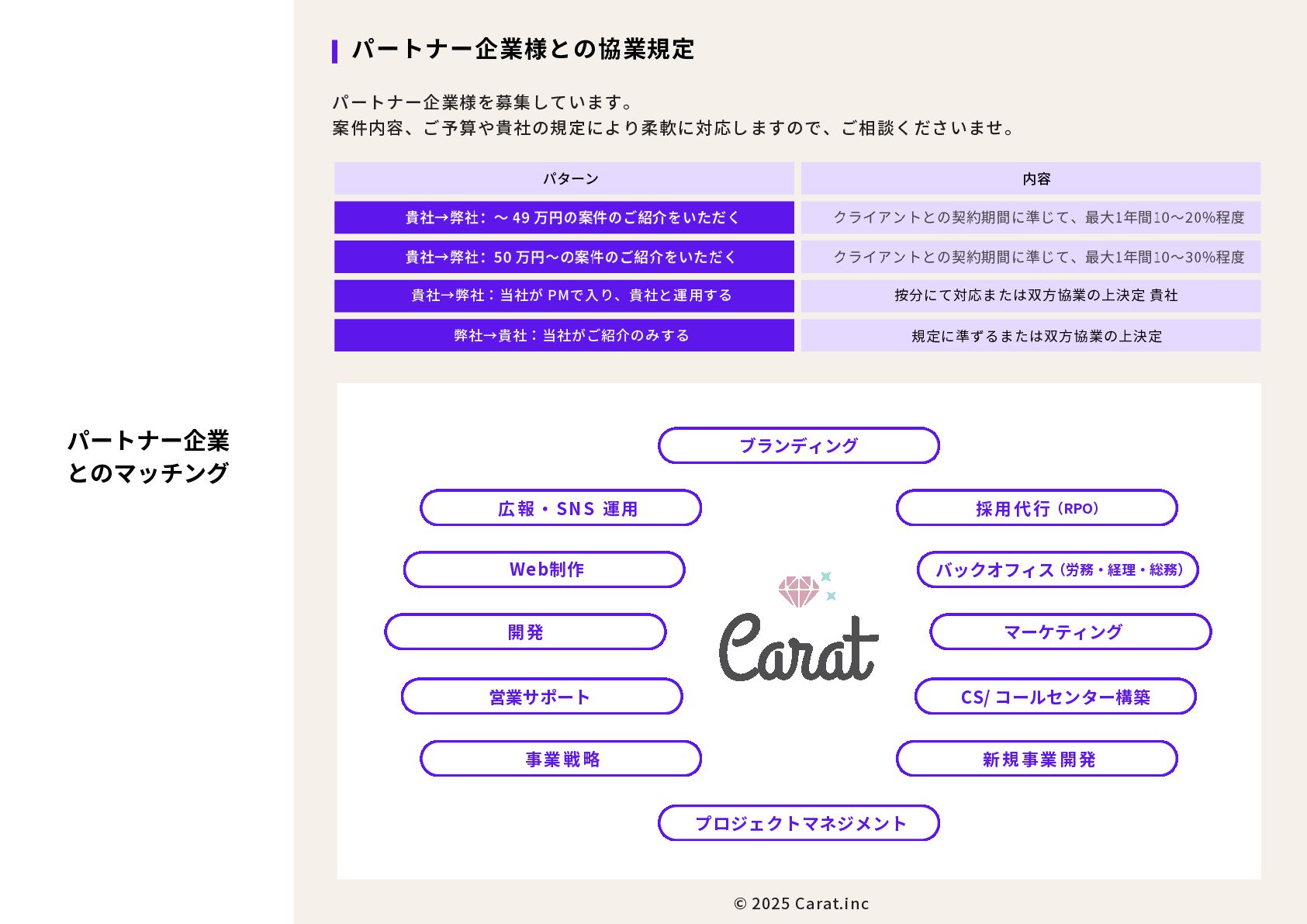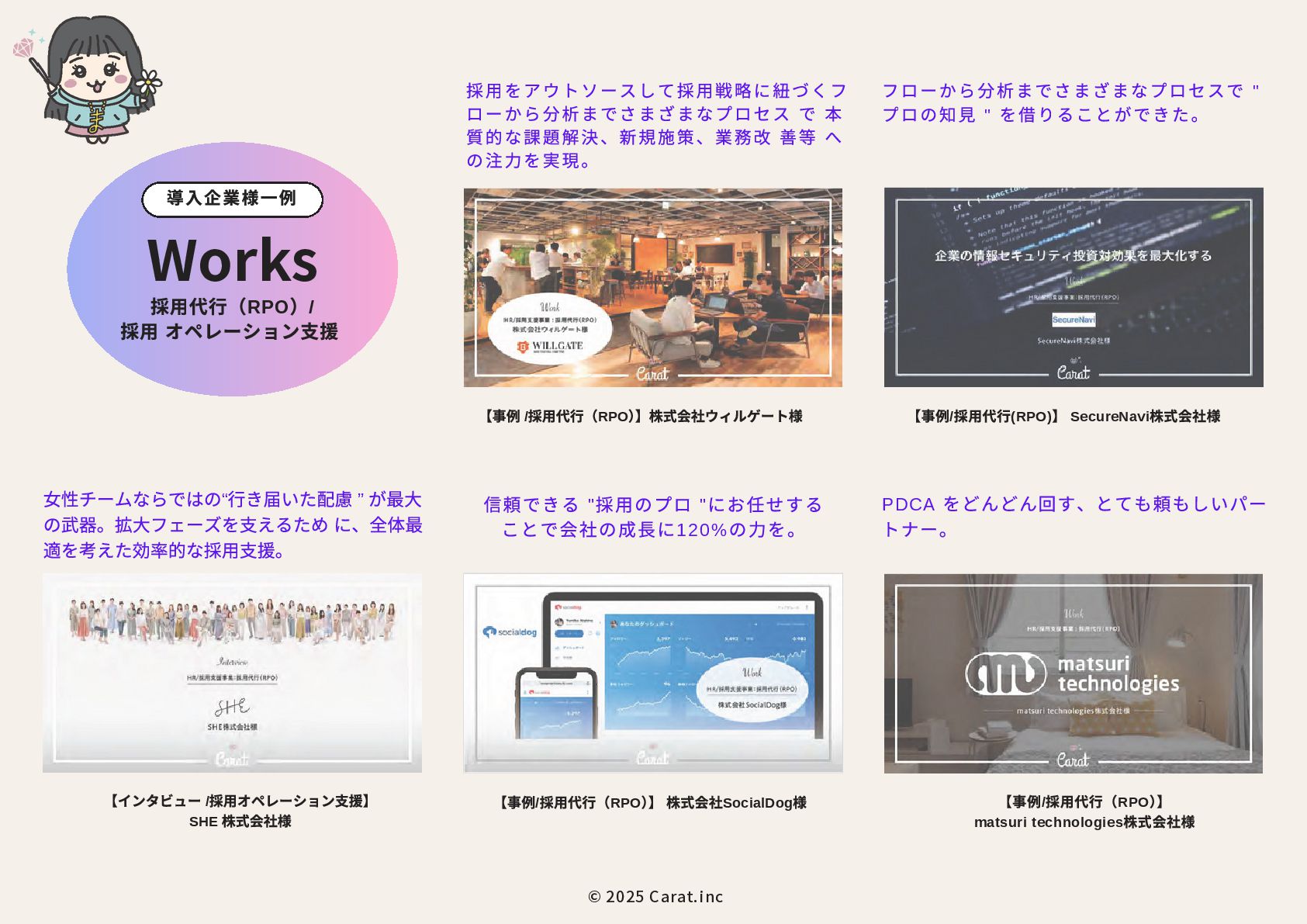 全員女性のフリーランスチームを のべ200名マネジメントをしたPMが担当 代表取締役社長 NAKAYA MARI 中屋まり Profile #HR #Recruiting #PR 新卒で株式会社パソナテックに入社後、サイバーエージェントグループの株式会社 CyberXにて採用広報を担当。以降、IT・飲食・アパレル・小売・ベンチャー企業など、 多様な業界で新卒・中途・アルバイト・外国人・地方採用を含む、採用戦略設計・ブラ ンディング・教育設計に携わる。 2018年に独立、2019年に法人化。全員女性・フルリモートで構成されるディレクション チームを率い、これまでのべ250件以上の採用・広報・事業支援プロジェクトに参画。 採用支援にとどまらず、事業サイドにおいても“成果の出るチーム”を構築・自走させる 伴走型支援に定評がある。 RPO事業や新規事業など、現場で動く事業チーム自体の立ち上げ・運用設計・改善支援 も実施。採用と事業、両軸からの仕組み化と成果創出に貢献している。 CHRO就任経験、昭和女子大学でのゲスト講師登壇など、教育・人材領域における発信 活動にも注力している。 予算、期間、対応範囲など 貴社のご要望にあわせて活用可能 採用、採用ブランディング 事業展開において企画、戦略、運用、 実行まで対応可能 最終的には貴社にノウハウや ナレッジが残る形でご提供 © 2025 Carat.inc サービス展開×事業推進の両軸で丁寧に、柔軟に、繊細にサポートをしてまいります。 セルフプロデュース事業 30-40代に向けた、セルフプロデュース事 業を展開しています。 ◉キャリアコンサルティング/エージェン トマッチング キャリア面談後に、最適なエージェントと のマッチングをいたします。 ◉アンチエイジング 幹細胞、美容用品の代理店。 (準備中) 占い代理店 プロジェクトマネジメント事業 強いチームを作る、プロジェクトマネジ メント事業を展開しています。 ◉採用支援、採用ブランディング支援 ◉RPO事業のスケーラブル支援 ◉スポットにて、スカウト代行、Webサ イト、資料制作など