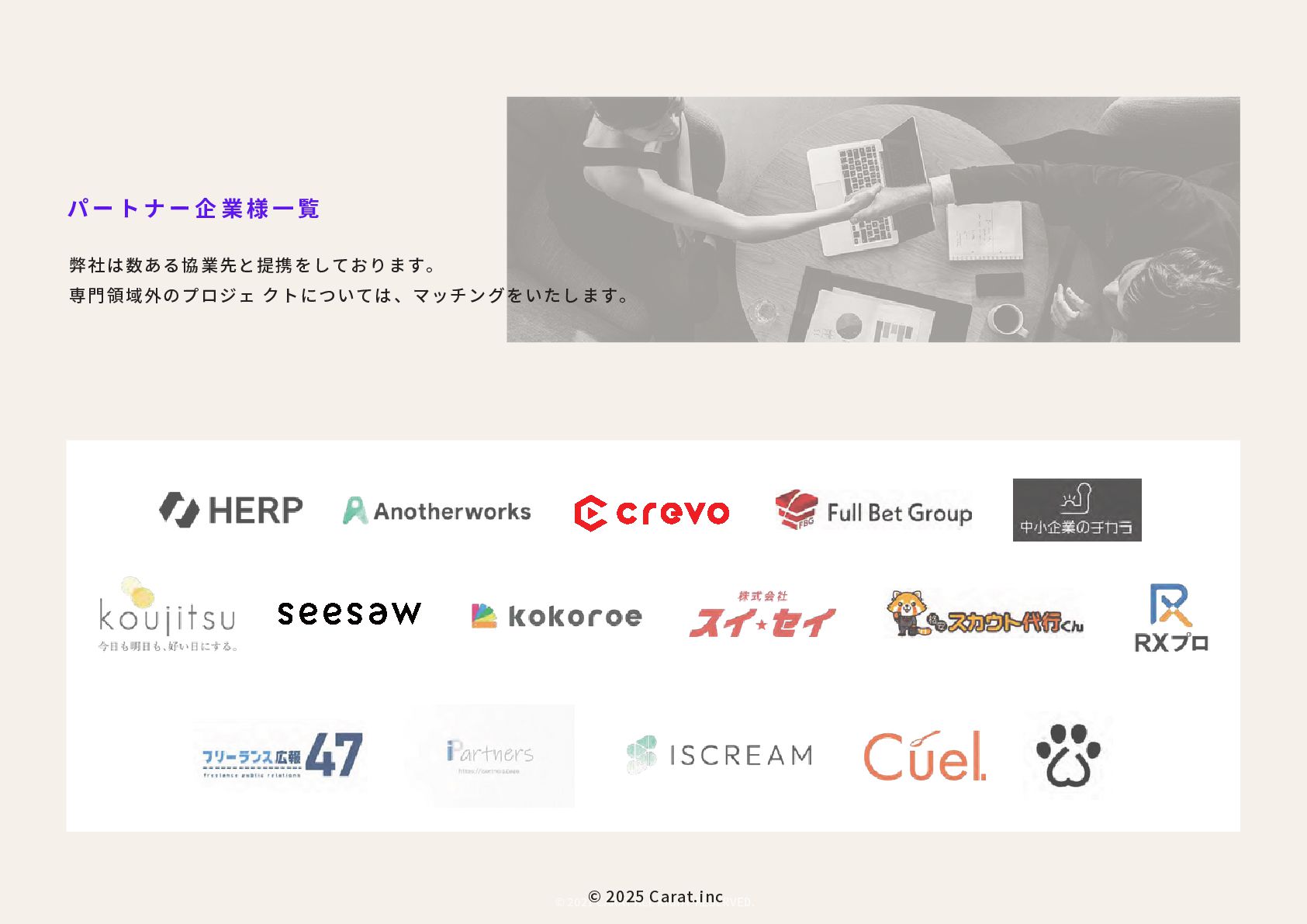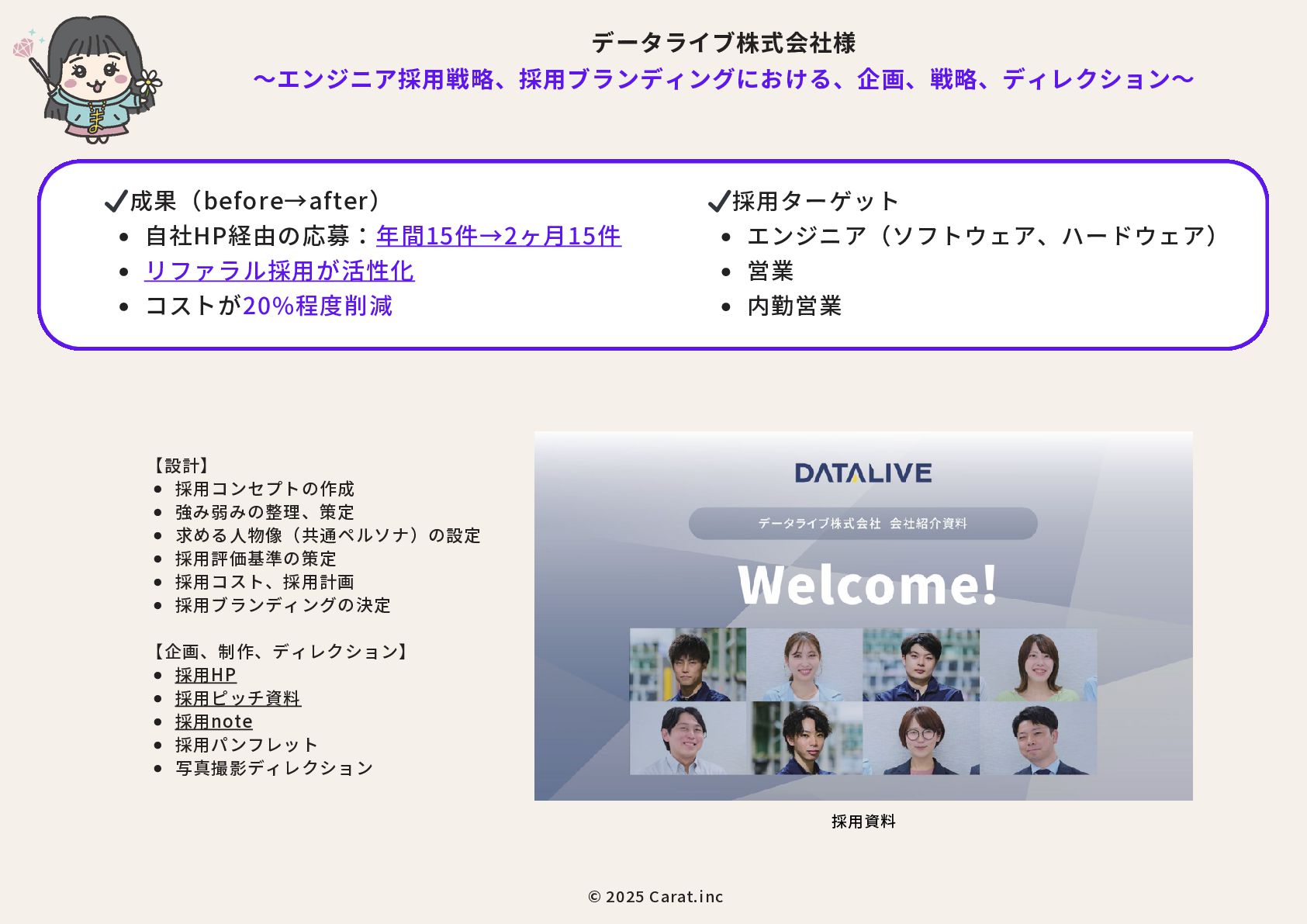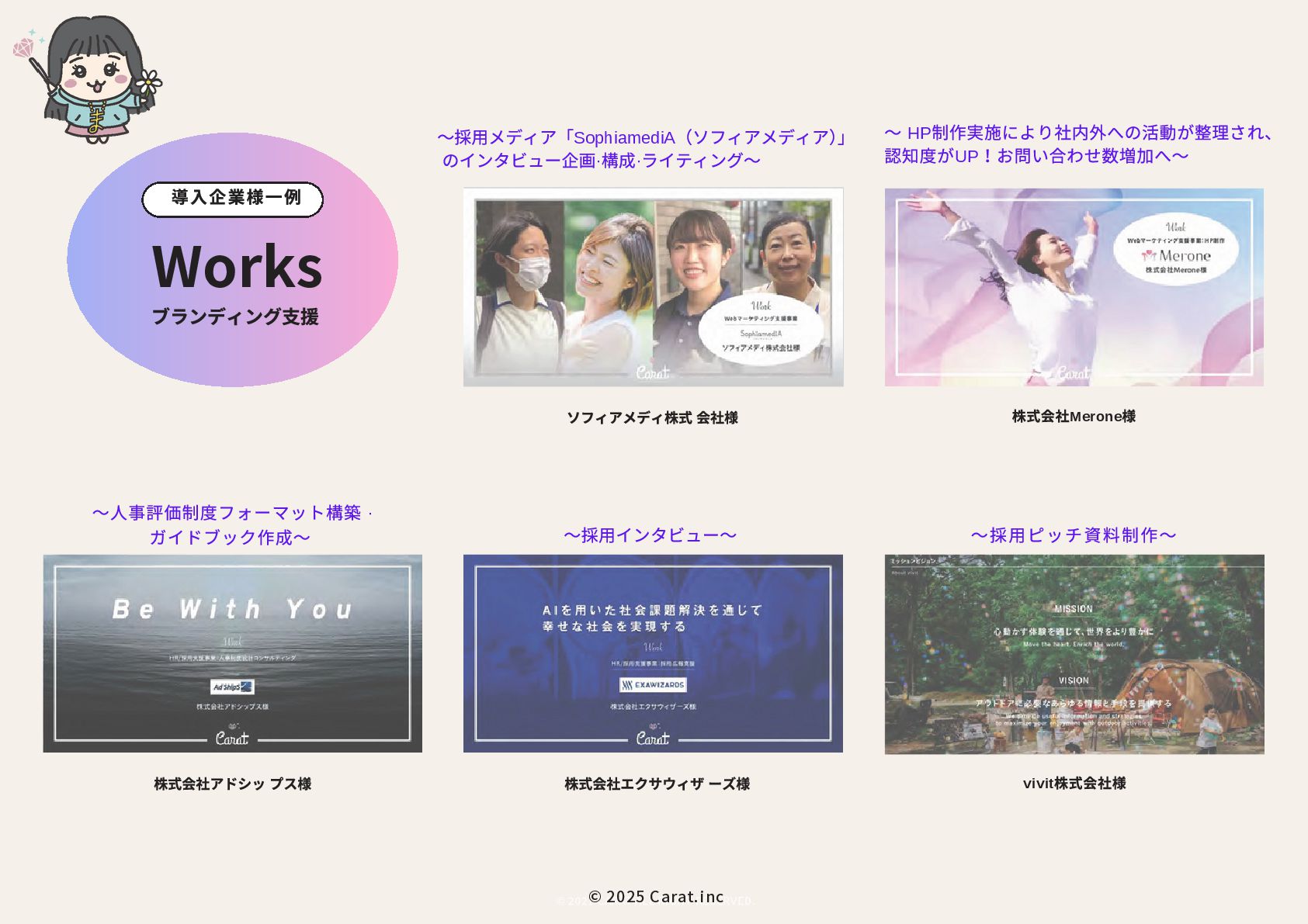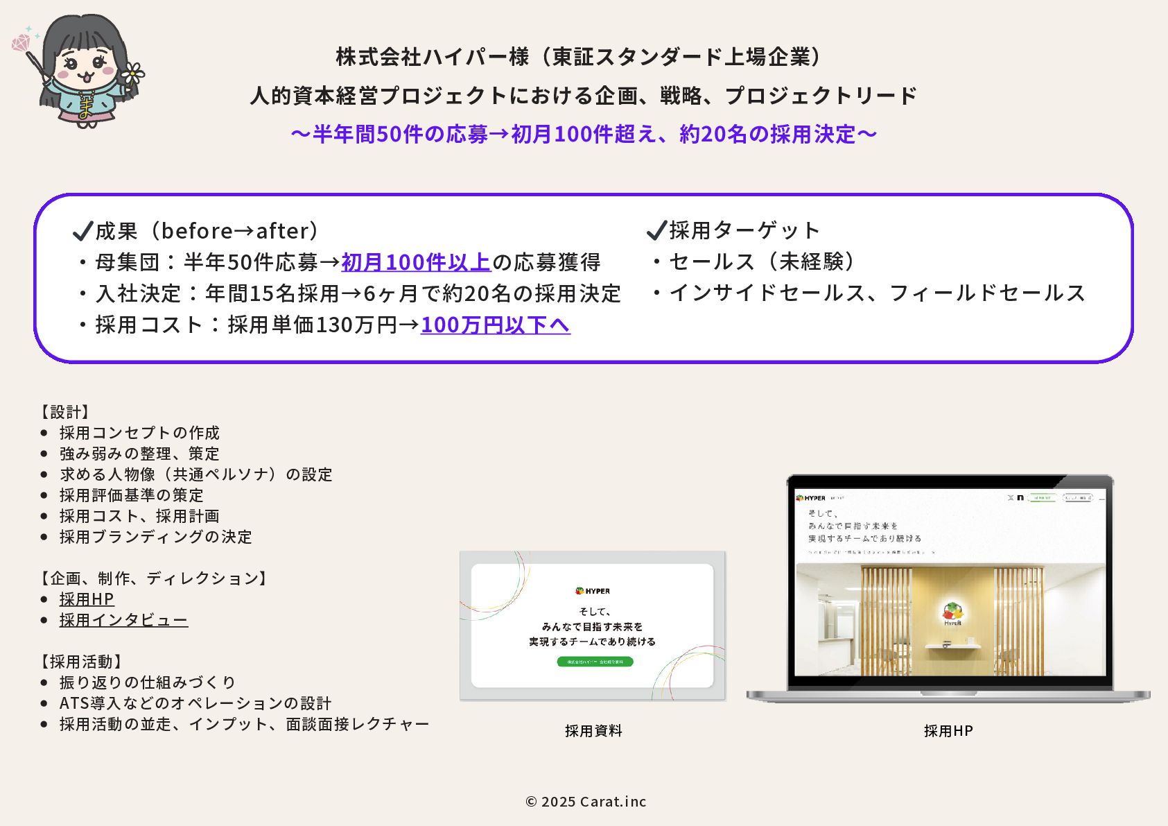 全員女性のフリーランスチームを のべ200名マネジメントをしたPMが担当 代表取締役社長 NAKAYA MARI 中屋まり Profile #HR #Recruiting #PR 新卒で株式会社パソナテックに入社後、サイバーエージェントグループの株式会社 CyberXにて採用広報を担当。以降、IT・飲食・アパレル・小売・ベンチャー企業など、 多様な業界で新卒・中途・アルバイト・外国人・地方採用を含む、採用戦略設計・ブラ ンディング・教育設計に携わる。 2018年に独立、2019年に法人化。全員女性・フルリモートで構成されるディレクション チームを率い、これまでのべ250件以上の採用・広報・事業支援プロジェクトに参画。 採用支援にとどまらず、事業サイドにおいても“成果の出るチーム”を構築・自走させる 伴走型支援に定評がある。 RPO事業や新規事業など、現場で動く事業チーム自体の立ち上げ・運用設計・改善支援 も実施。採用と事業、両軸からの仕組み化と成果創出に貢献している。 CHRO就任経験、昭和女子大学でのゲスト講師登壇など、教育・人材領域における発信 活動にも注力している。 予算、期間、対応範囲など 貴社のご要望にあわせて活用可能 採用、採用ブランディング 事業展開において企画、戦略、運用、 実行まで対応可能 最終的には貴社にノウハウや ナレッジが残る形でご提供 © 2025 Carat.inc サービス展開×事業推進の両軸で丁寧に、柔軟に、繊細にサポートをしてまいります。 セルフプロデュース事業 30-40代に向けた、セルフプロデュース事 業を展開しています。 ◉キャリアコンサルティング/エージェン トマッチング キャリア面談後に、最適なエージェントと のマッチングをいたします。 ◉アンチエイジング 幹細胞、美容用品の代理店。 (準備中) 占い代理店 プロジェクトマネジメント事業 強いチームを作る、プロジェクトマネジ メント事業を展開しています。 ◉採用支援、採用ブランディング支援 ◉RPO事業のスケーラブル支援 ◉スポットにて、スカウト代行、Webサ イト、資料制作など