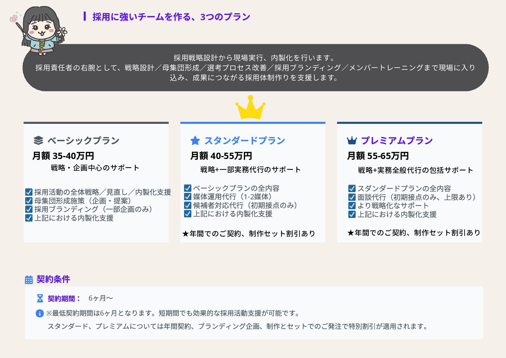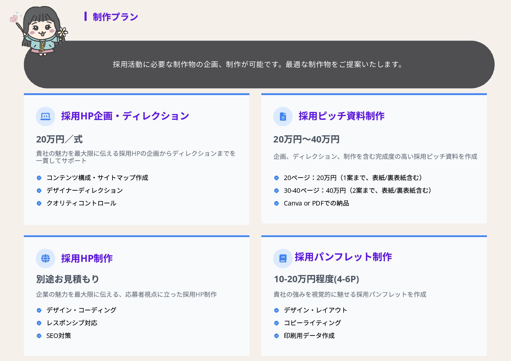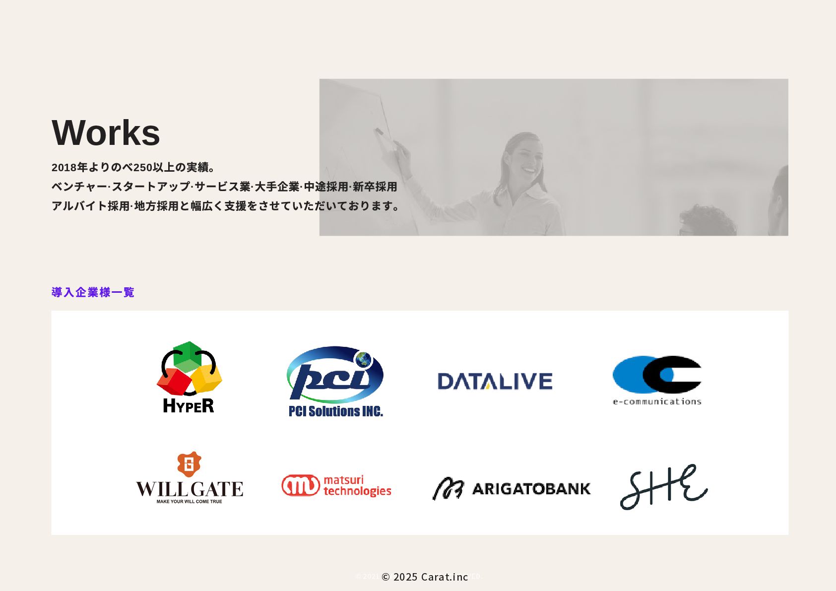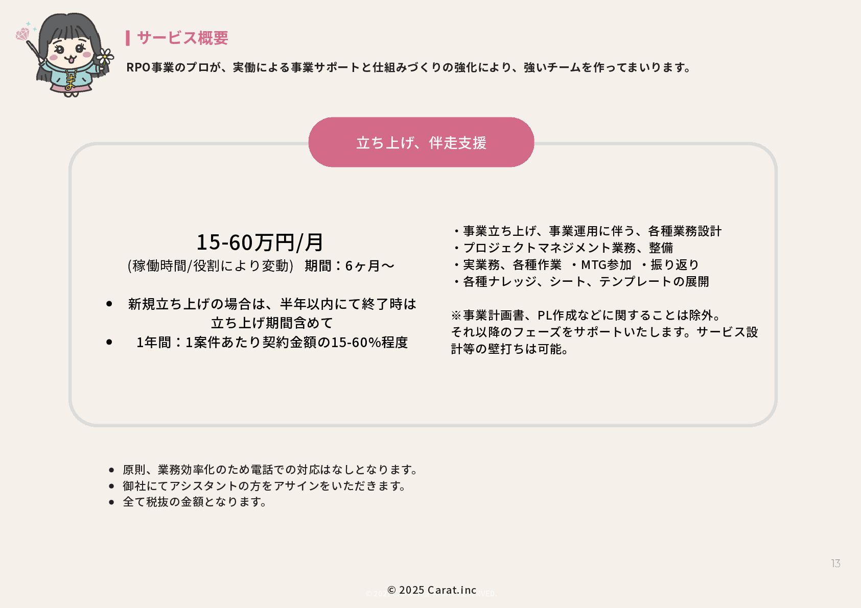全員女性のフリーランスチームを のべ200名マネジメントをしたPMが担当 代表取締役社長 NAKAYA MARI 中屋まり Profile #HR #Recruiting #PR 新卒で株式会社パソナテックに入社後、サイバーエージェントグループの株式会社 CyberXにて採用広報を担当。以降、IT・飲食・アパレル・小売・ベンチャー企業など、 多様な業界で新卒・中途・アルバイト・外国人・地方採用を含む、採用戦略設計・ブラ ンディング・教育設計に携わる。 2018年に独立、2019年に法人化。全員女性・フルリモートで構成されるディレクション チームを率い、これまでのべ250件以上の採用・広報・事業支援プロジェクトに参画。 採用支援にとどまらず、事業サイドにおいても“成果の出るチーム”を構築・自走させる 伴走型支援に定評がある。 RPO事業や新規事業など、現場で動く事業チーム自体の立ち上げ・運用設計・改善支援 も実施。採用と事業、両軸からの仕組み化と成果創出に貢献している。 CHRO就任経験、昭和女子大学でのゲスト講師登壇など、教育・人材領域における発信 活動にも注力している。 予算、期間、対応範囲など 貴社のご要望にあわせて活用可能 採用、採用ブランディング 事業展開において企画、戦略、運用、 実行まで対応可能 最終的には貴社にノウハウや ナレッジが残る形でご提供 © 2025 Carat.inc サービス展開×事業推進の両軸で丁寧に、柔軟に、繊細にサポートをしてまいります。 セルフプロデュース事業 30-40代に向けた、セルフプロデュース事 業を展開しています。 ◉キャリアコンサルティング/エージェン トマッチング キャリア面談後に、最適なエージェントと のマッチングをいたします。 ◉アンチエイジング 幹細胞、美容用品の代理店。 (準備中) 占い代理店 プロジェクトマネジメント事業 強いチームを作る、プロジェクトマネジ メント事業を展開しています。 ◉採用支援、採用ブランディング支援 ◉RPO事業のスケーラブル支援 ◉スポットにて、スカウト代行、Webサ イト、資料制作など