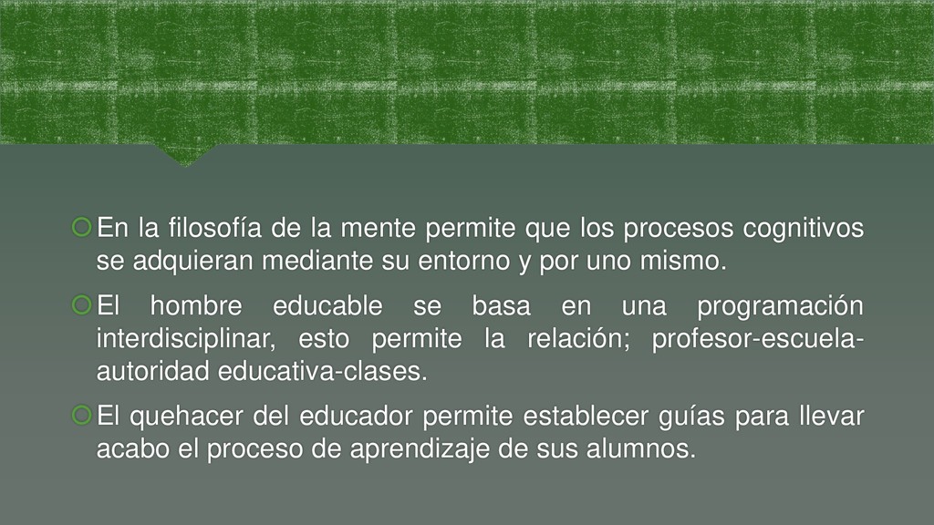 cognitivos se adquieran mediante su entorno y por uno mismo. El hombre educable se basa en una programación interdisciplinar, esto permite la relación; profesor-escuela- autoridad educativa-clases. El quehacer del educador permite establecer guías para llevar acabo el proceso de aprendizaje de sus alumnos.