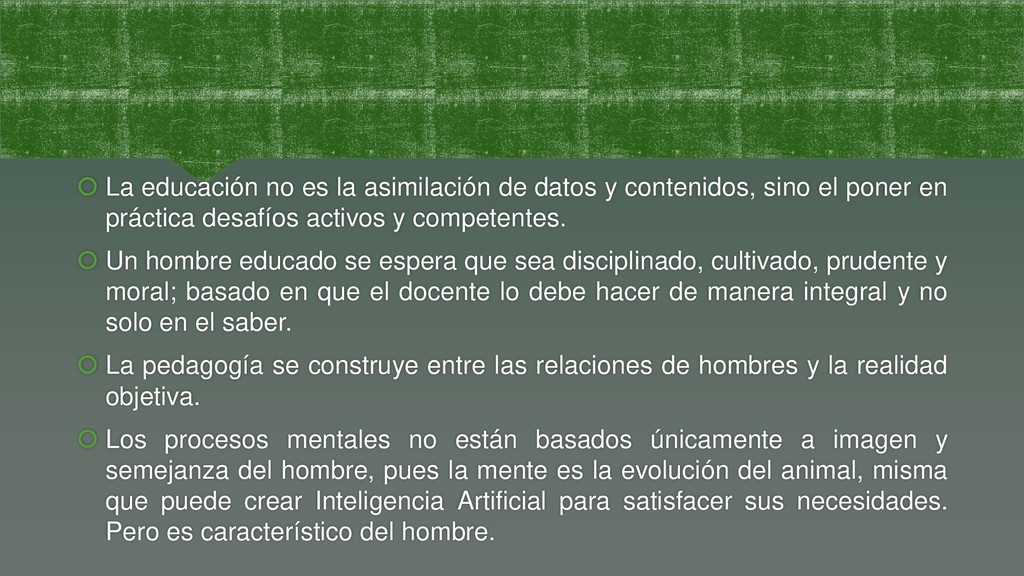 contenidos, sino el poner en práctica desafíos activos y competentes. Un hombre educado se espera que sea disciplinado, cultivado, prudente y moral; basado en que el docente lo debe hacer de manera integral y no solo en el saber. La pedagogía se construye entre las relaciones de hombres y la realidad objetiva. Los procesos mentales no están basados únicamente a imagen y semejanza del hombre, pues la mente es la evolución del animal, misma que puede crear Inteligencia Artificial para satisfacer sus necesidades. Pero es característico del hombre.